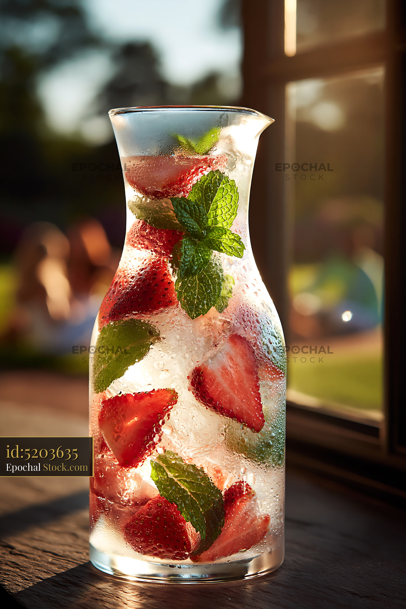 A cold glass carafe filled with fresh strawberries, mint leaves, and ice cubes sits on a wooden table in the warm afternoon sun, evoking a sense of summer relaxation and healthy hydration.