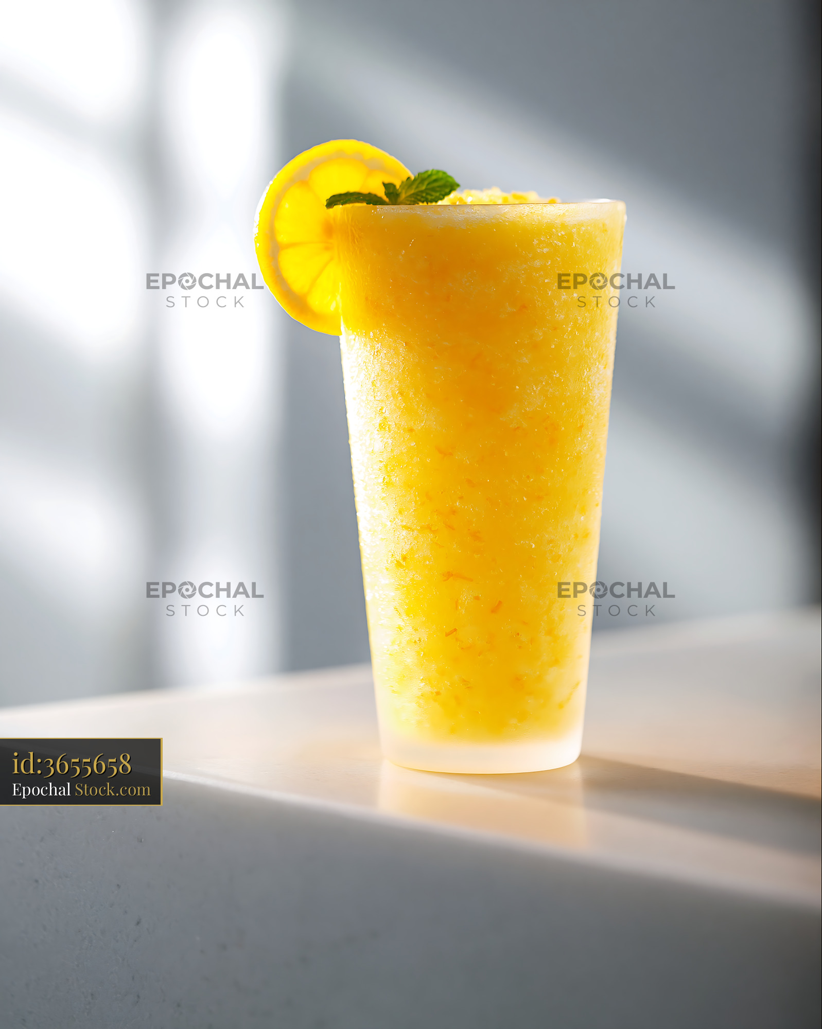 A vibrant yellow yuja citron smoothie garnished with a fresh lemon slice and mint, sitting on a white surface in soft sunlight, evoking a refreshing summer mood and healthy citrus flavor.