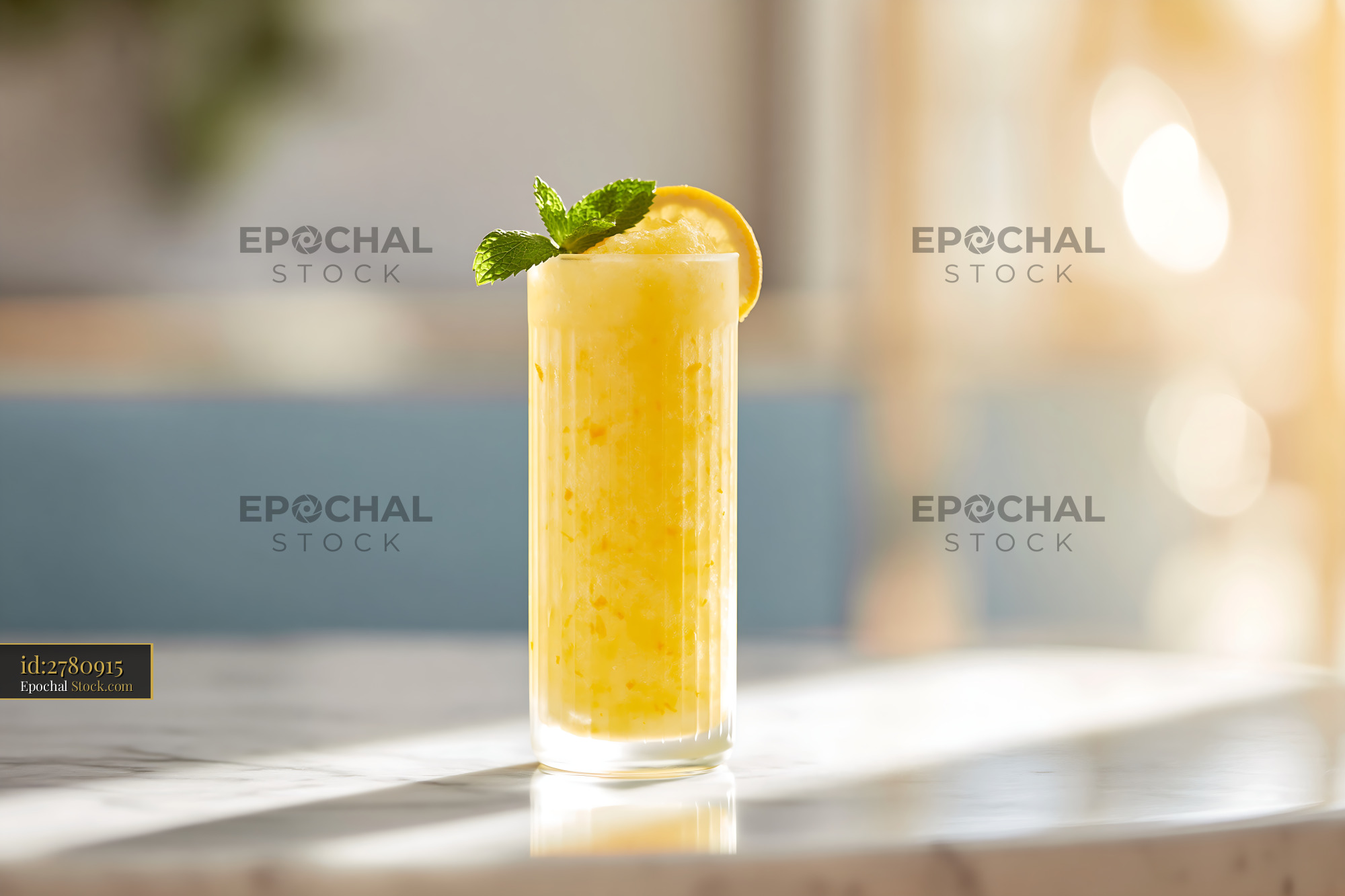A vibrant yellow yuja citron smoothie garnished with fresh mint sits on a marble surface in warm sunlight, evoking a refreshing summer mood and healthy lifestyle.