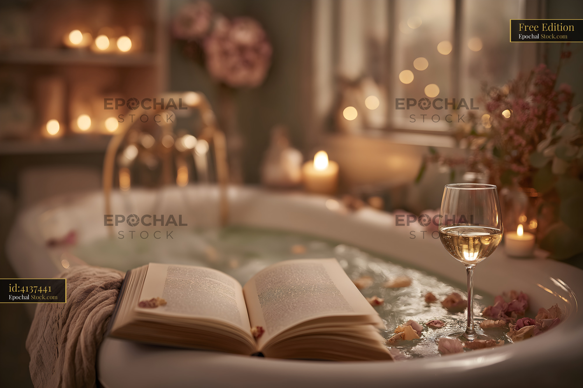 A tub filled with water and flower petals sits in a cozy room. A glass of wine rests next to an open book. Soft candlelight creates a warm glow in the evening setting.