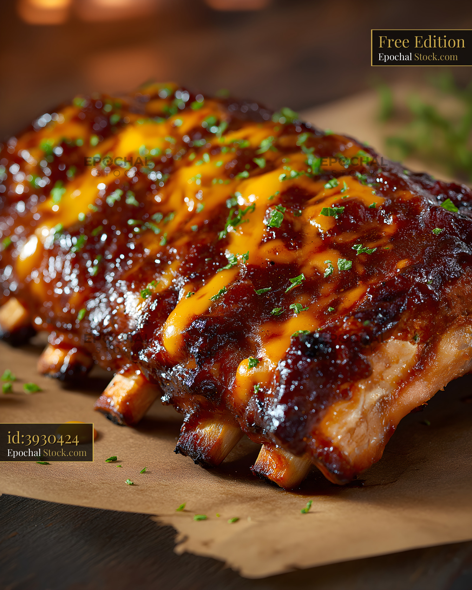 Ribs with barbecue sauce served on a rustic wooden table Free Premium Stock Image