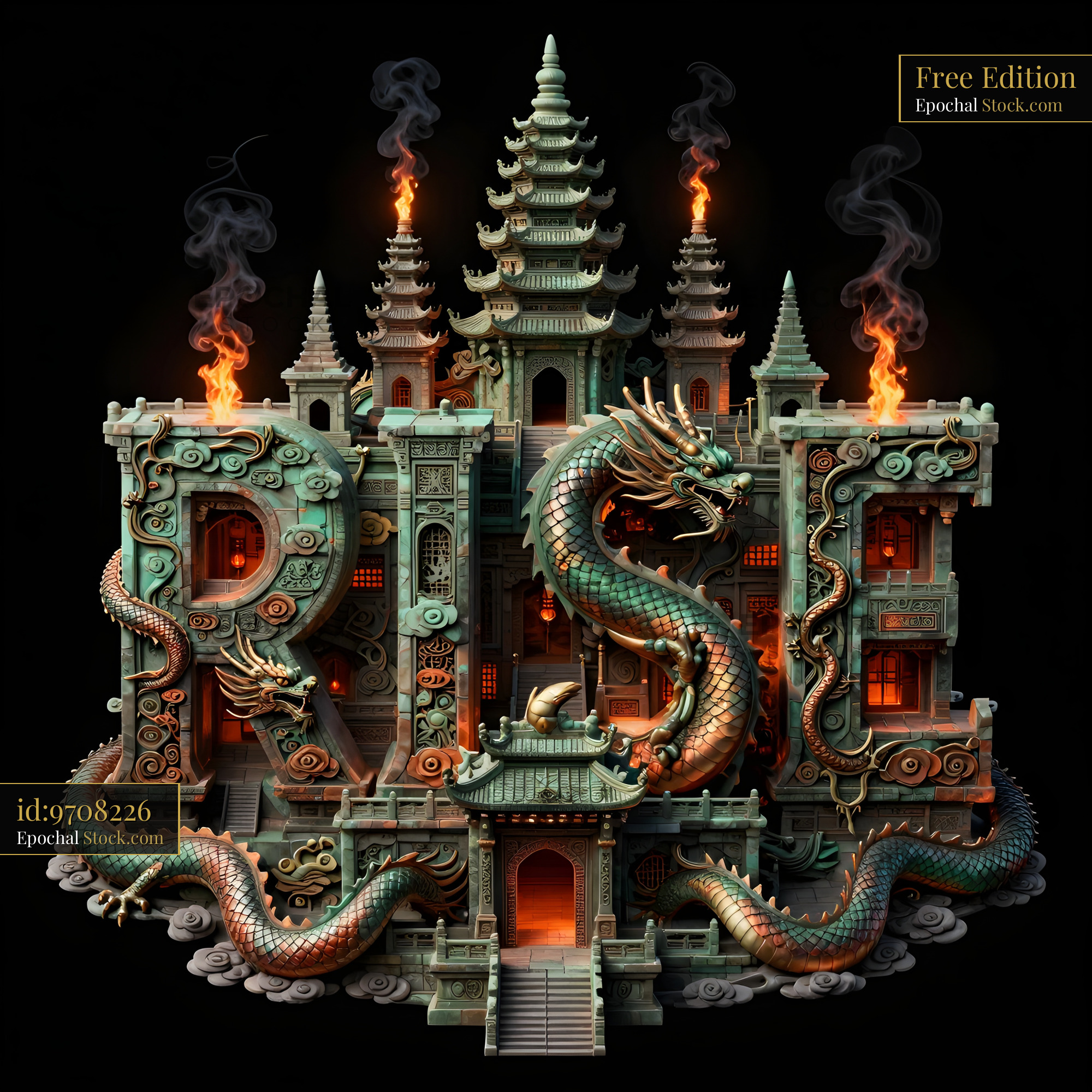 Rising dragon statue near ancient building with flames Free Premium Stock Image