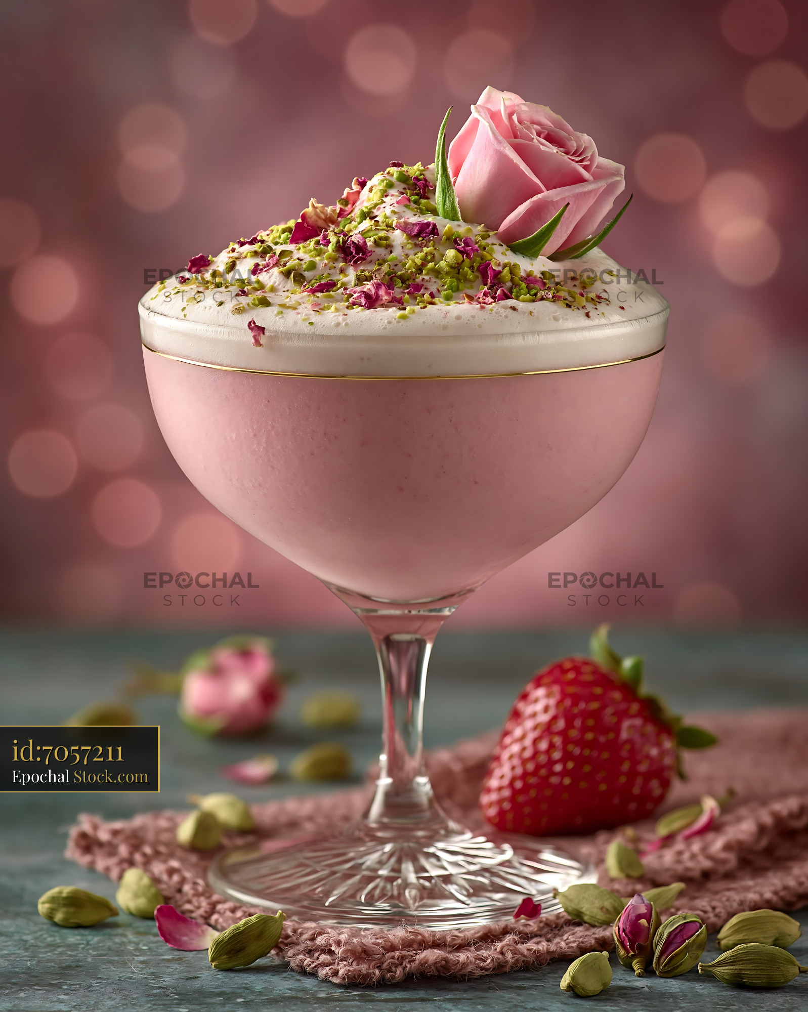 A delicate rose cardamom milkshake served in an elegant coupe glass, topped with crushed pistachios and a fresh pink rose, evoking a sense of refined indulgence and floral sweetness.