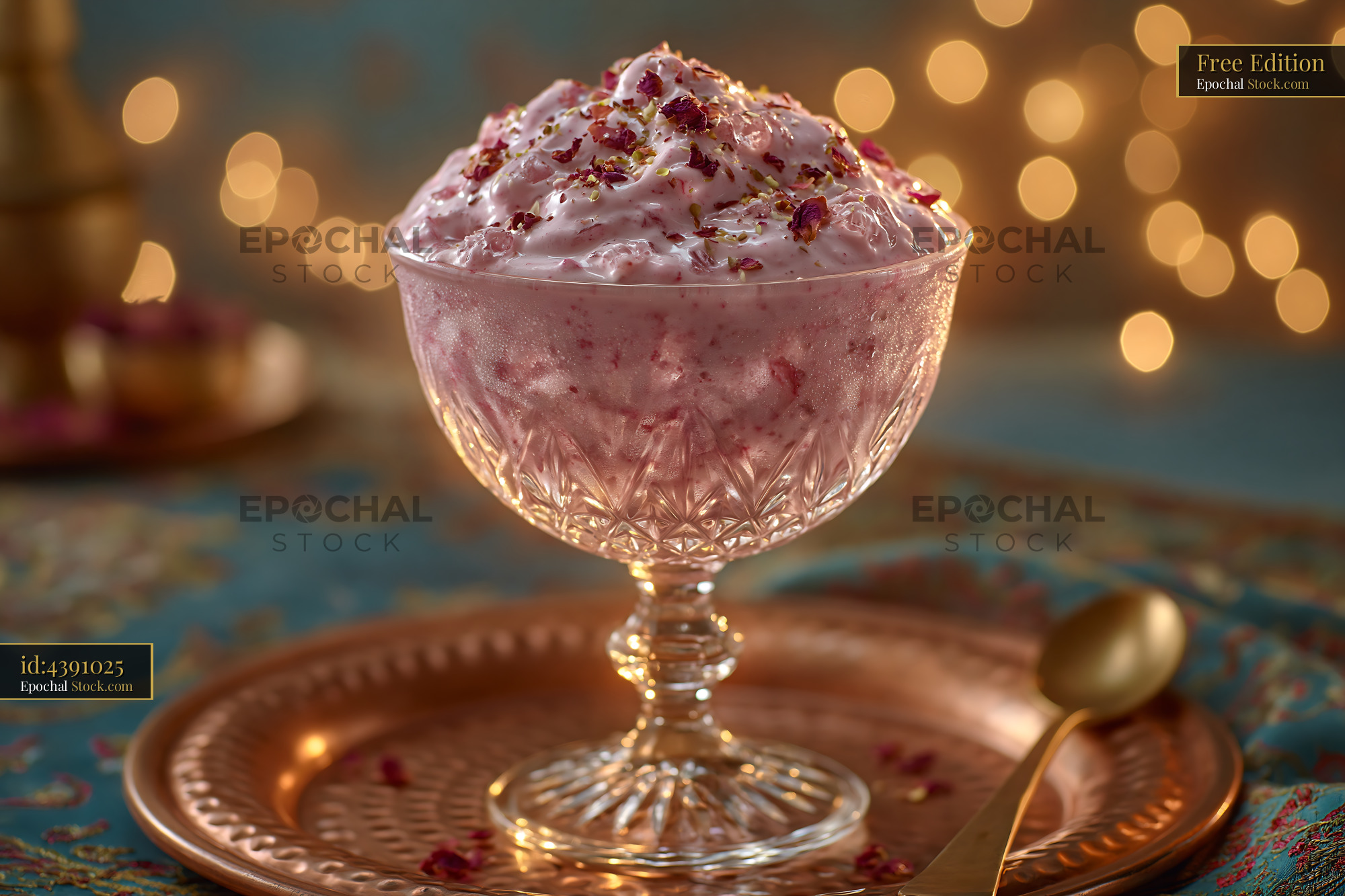 A creamy rose cardamom milkshake served in an elegant crystal glass, garnished with dried rose petals. The warm festive lighting and traditional copper tray evoke a sense of cultural celebration and dessert indulgence.