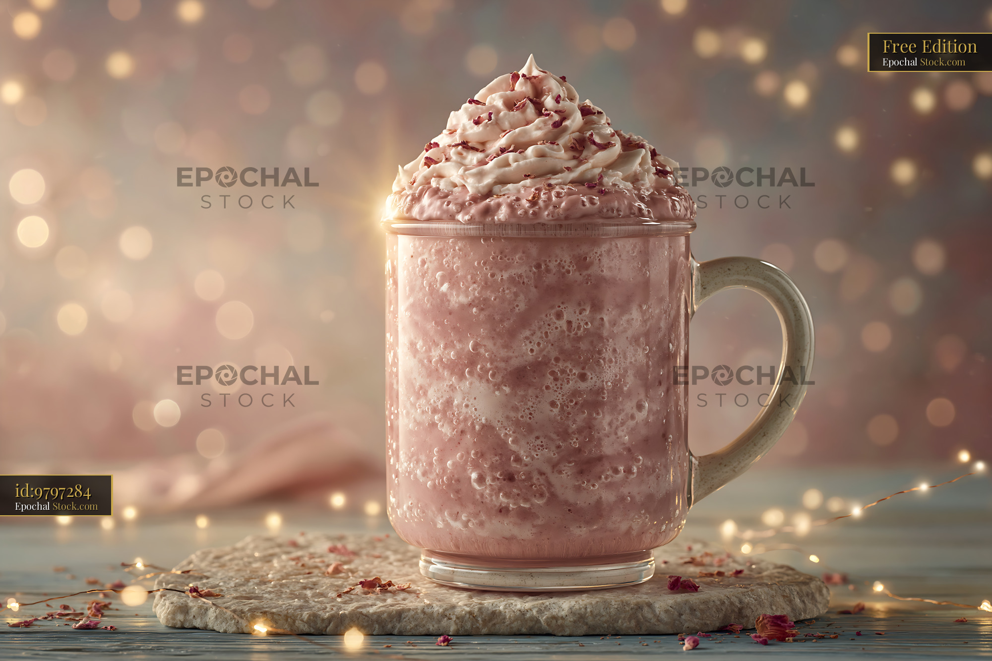 A creamy rose cardamom milkshake served in a glass mug, garnished with whipped cream and dried rose petals, set against a soft bokeh background with warm fairy lights, evoking indulgence and comfort.
