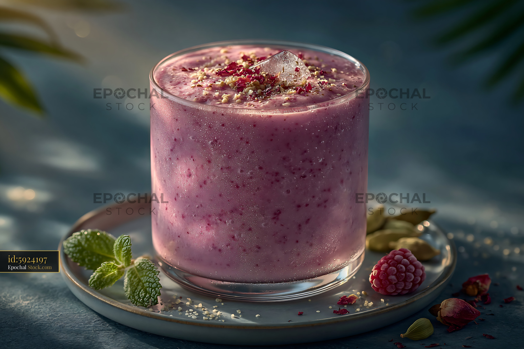 A refreshing rose cardamom milkshake garnished with dried rose petals and nuts, evoking a sense of culinary indulgence, exotic flavors, and mindful relaxation in a serene setting.