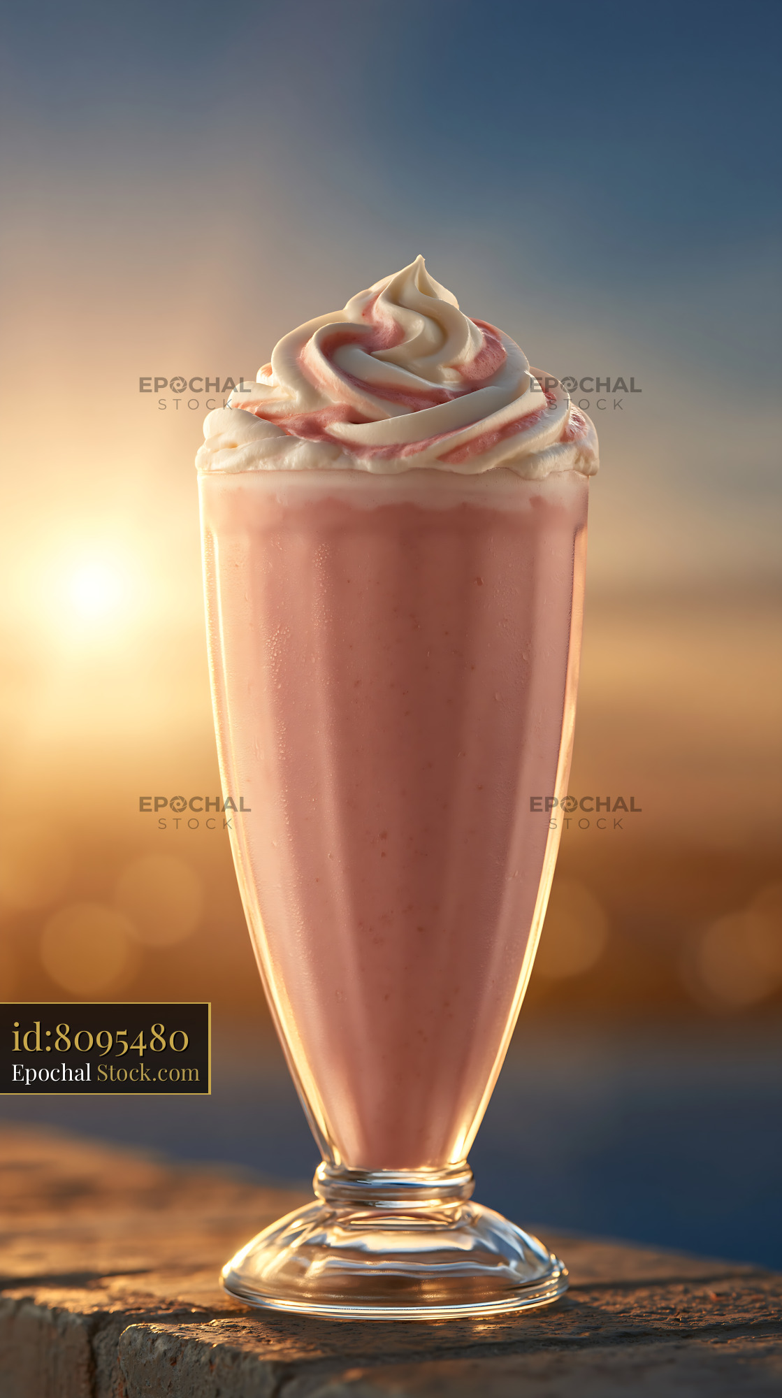 A refreshing rose cardamom milkshake topped with whipped cream sits on a stone surface against a warm, glowing sunset, evoking feelings of summer indulgence, relaxation, and sensory pleasure.