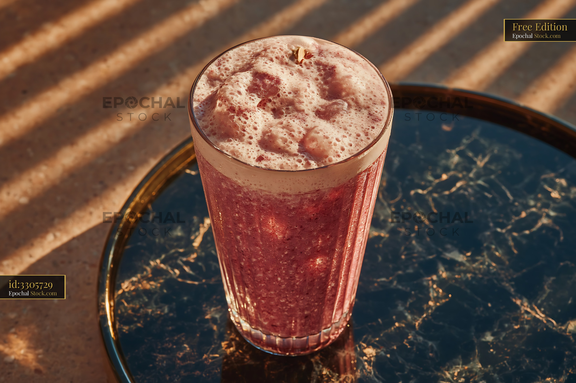A refreshing rose cardamom milkshake with a frothy top sits on a dark marble table, bathed in warm golden hour sunlight with dramatic striped shadows, evoking a sense of luxury and relaxation.