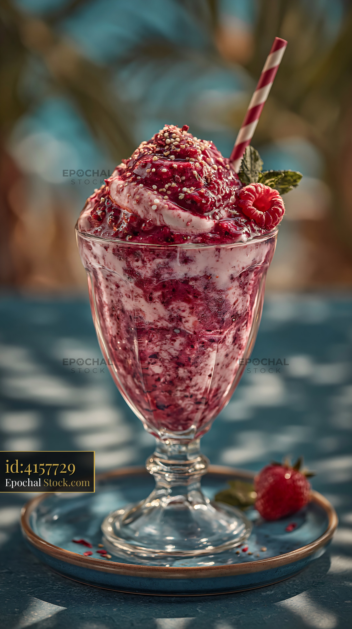 A refreshing rose cardamom milkshake garnished with fresh raspberries and mint, served in a classic glass on a sunny table, evoking feelings of summer indulgence and gourmet culinary delights.