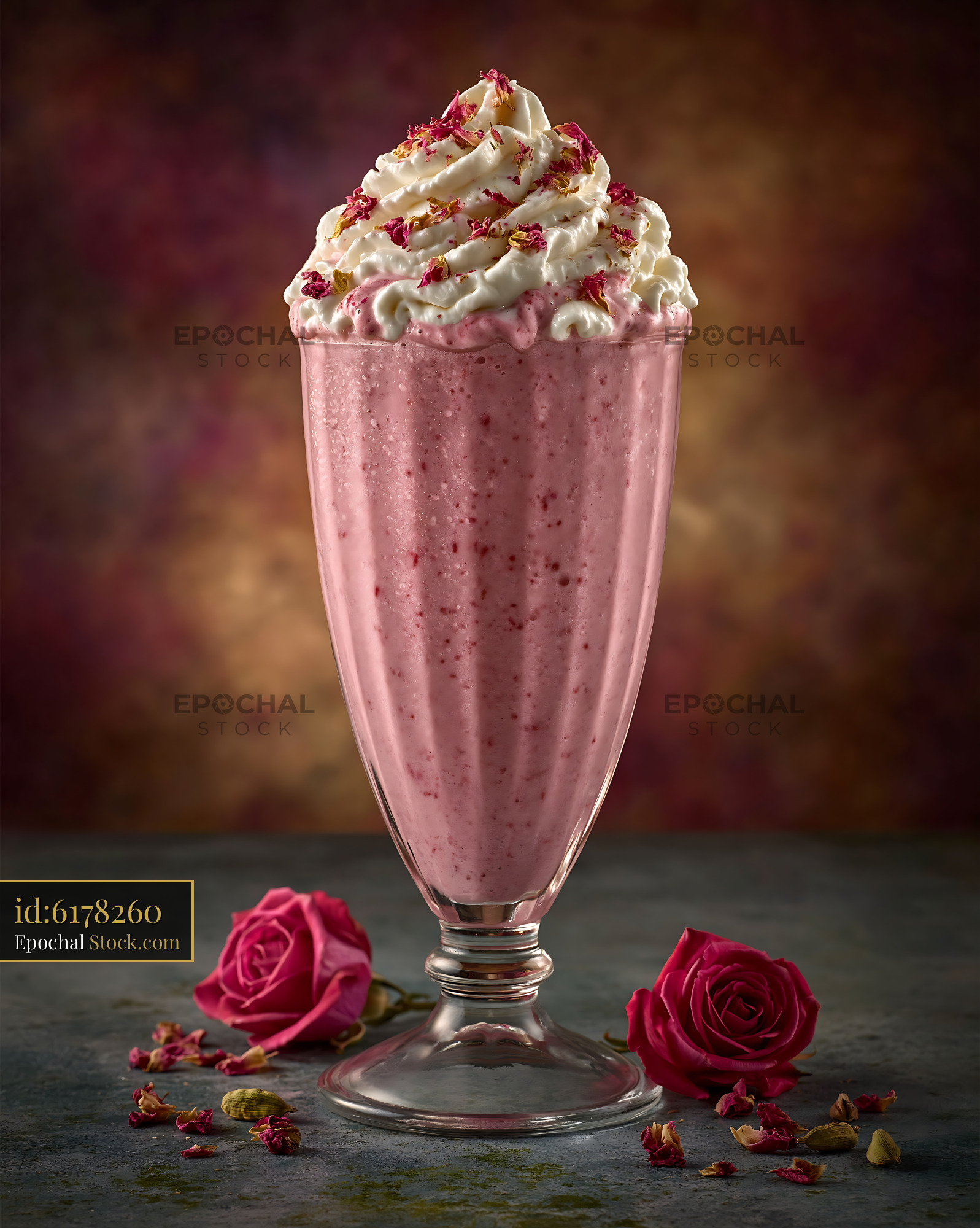 A creamy rose cardamom milkshake topped with whipped cream and dried petals, served in a tall glass with fresh roses, evoking themes of floral elegance and gourmet indulgence.