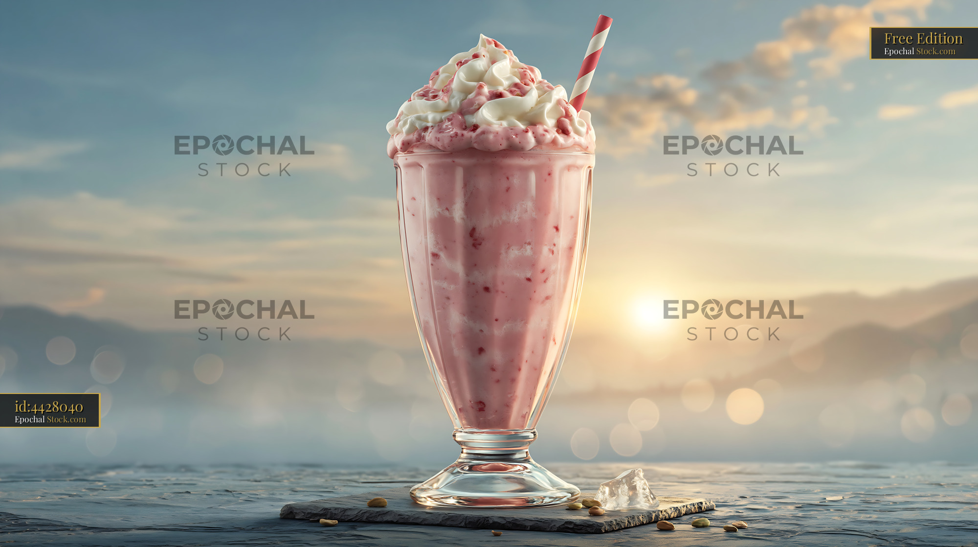A delicious rose cardamom milkshake topped with whipped cream, served in a classic glass against a dreamy sunset backdrop, evoking feelings of indulgence, relaxation, and sensory pleasure.