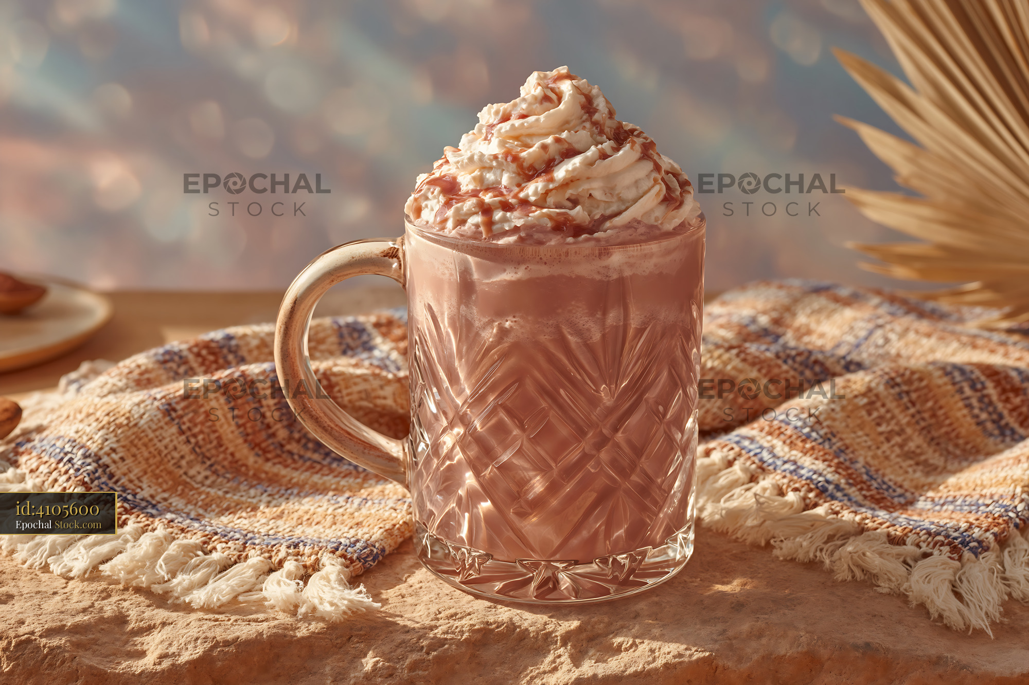 A luxurious rose cardamom milkshake topped with fluffy whipped cream and syrup, served on a rustic stone surface during golden hour, evoking exotic warmth and aromatic indulgence.