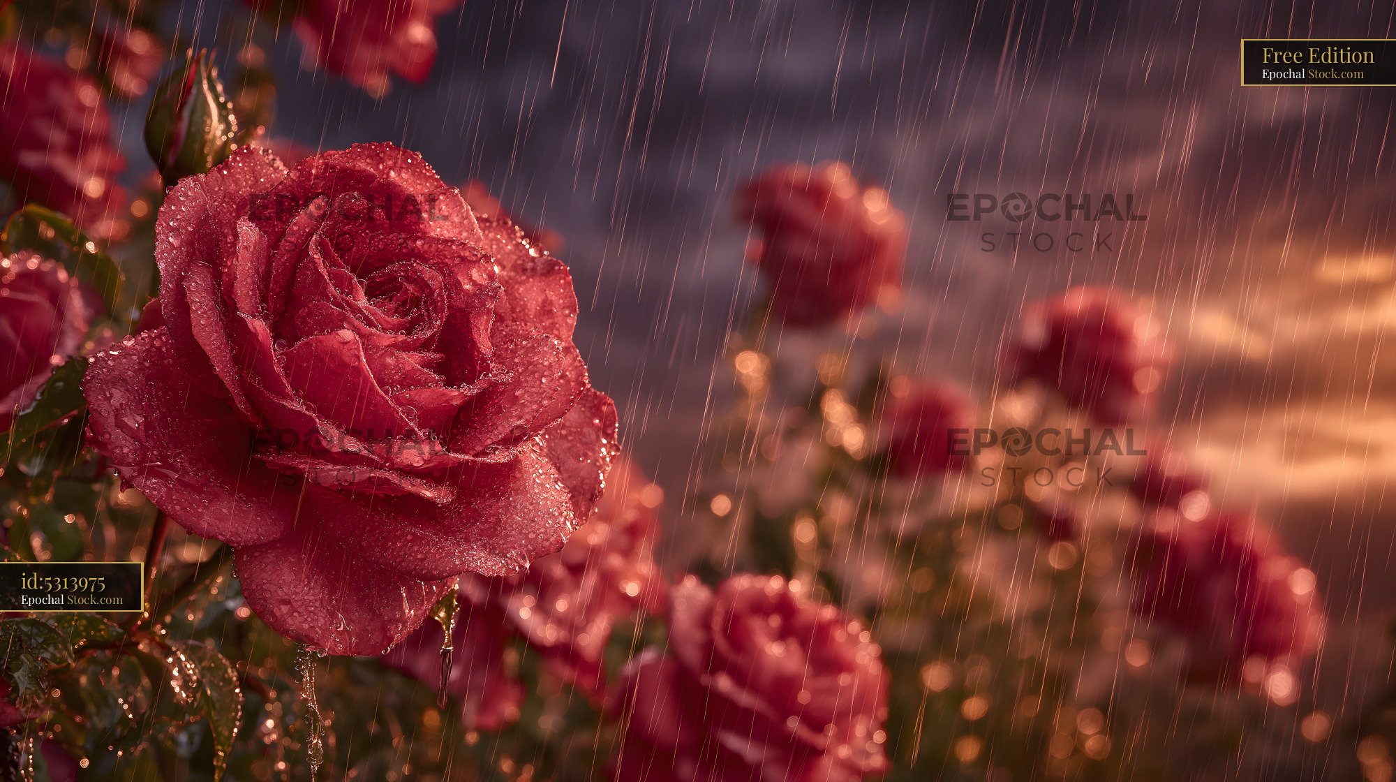 Red roses stand in a garden as rain falls. The sun sets in the background, creating a scene of blooming flowers with droplets glistening on their petals.
