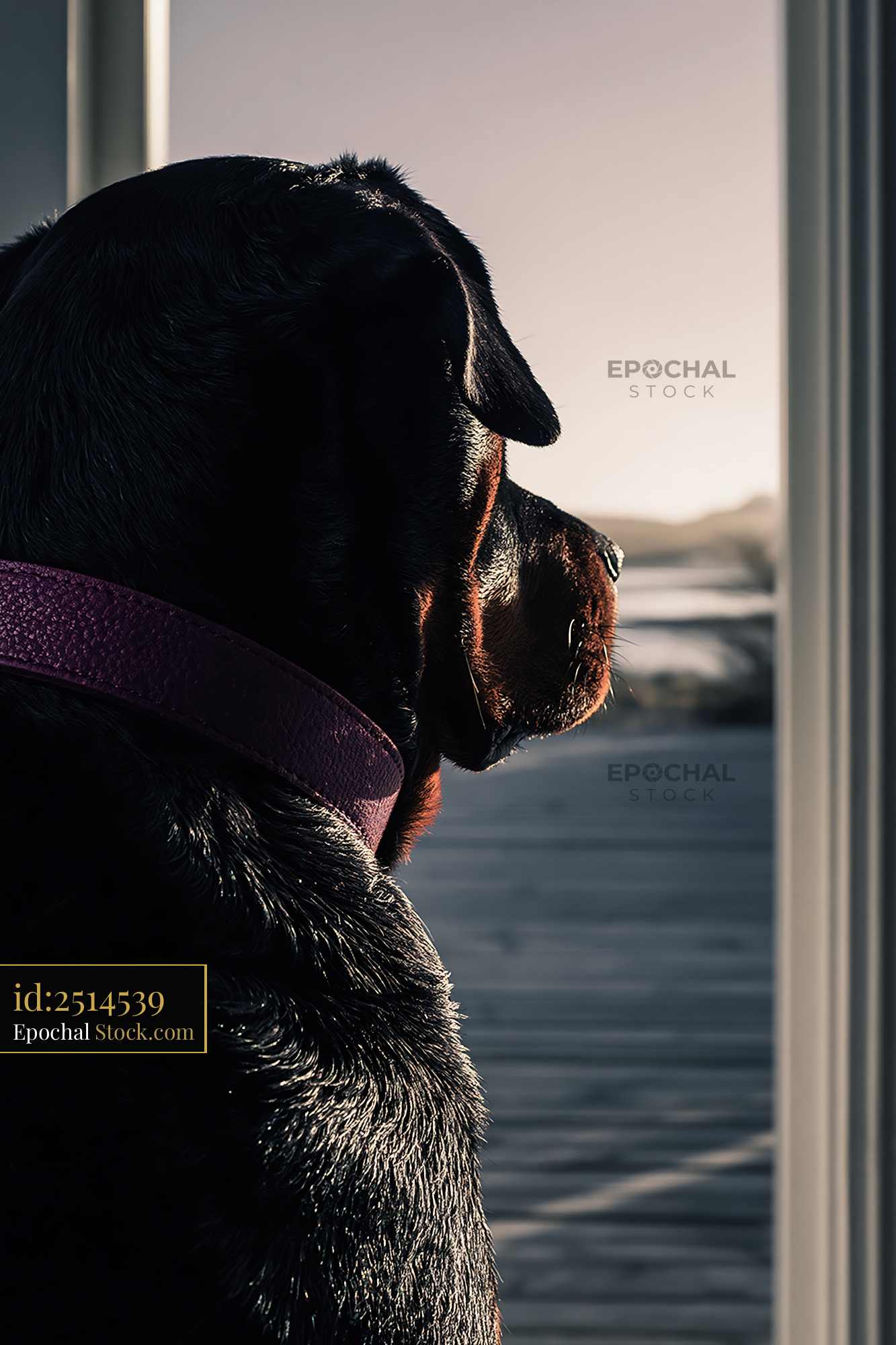 A loyal Rottweiler with a purple collar sits by a window, gazing thoughtfully at the horizon during the golden hour, evoking themes of waiting, patience, and companionship.
