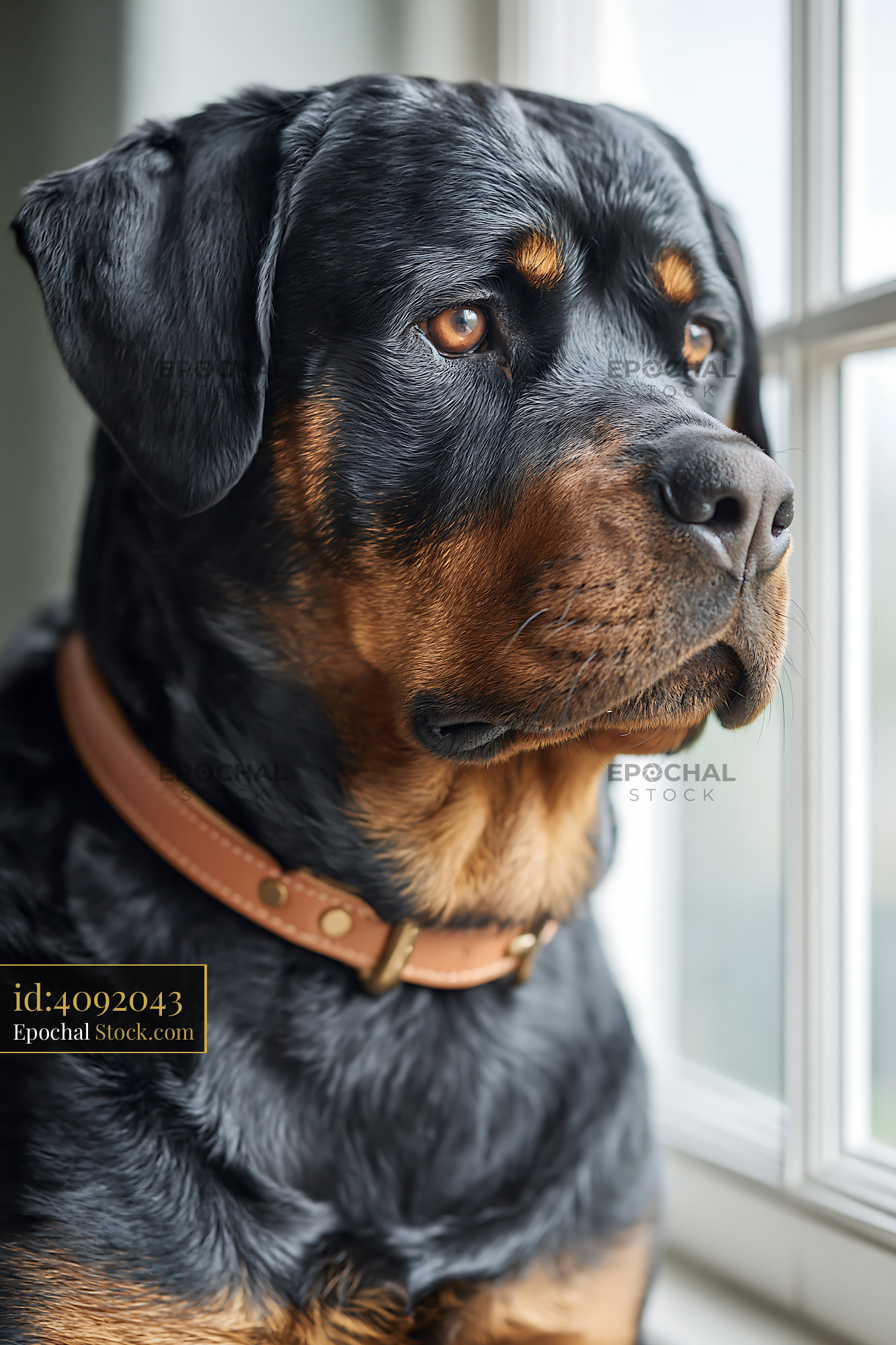 A loyal Rottweiler with a brown leather collar sits patiently by a window, gazing outside with a calm and thoughtful expression, evoking themes of companionship and waiting.