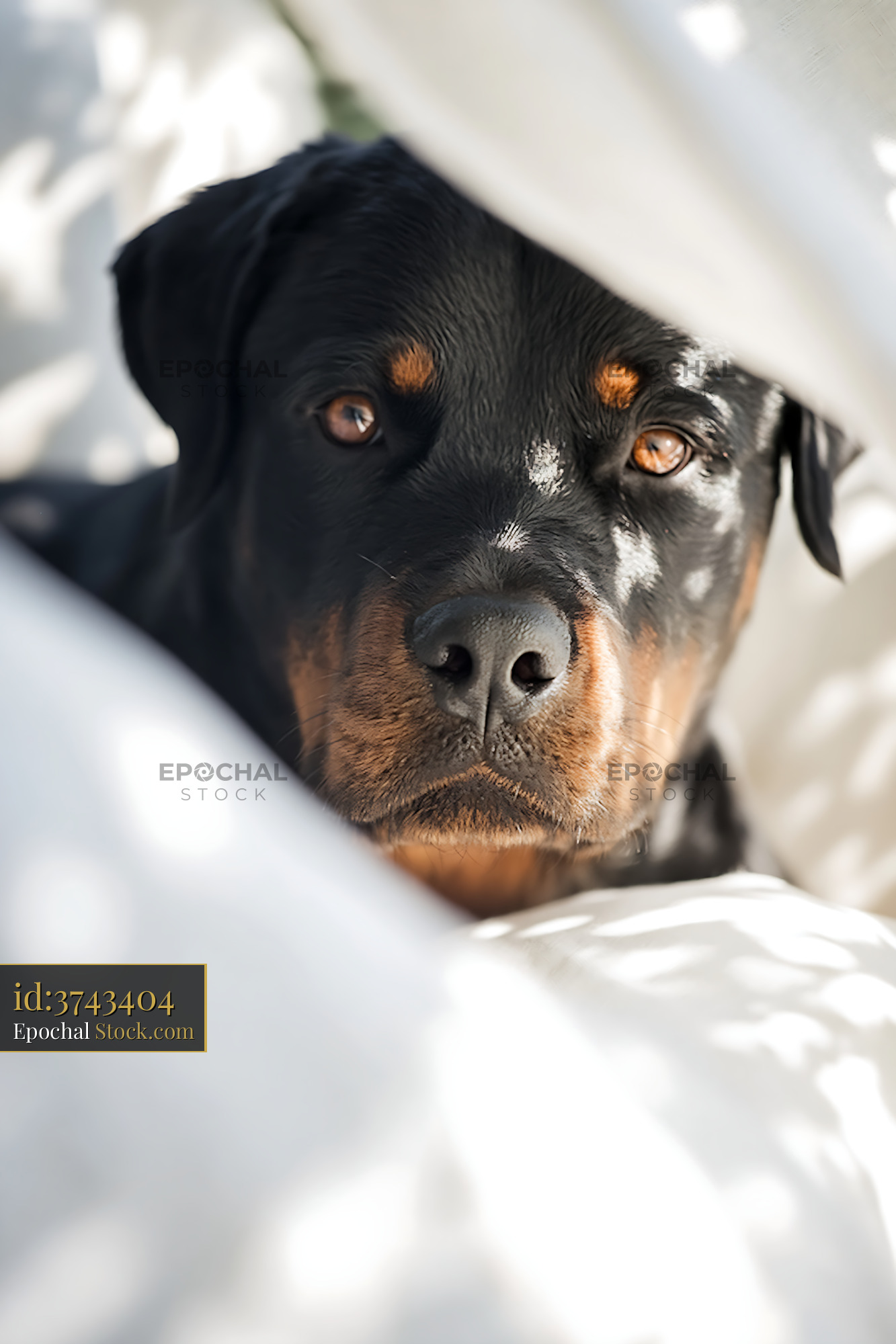 A gentle Rottweiler looks through soft white fabric, surrounded by dappled sunlight and shadows, evoking a peaceful and cozy domestic atmosphere.