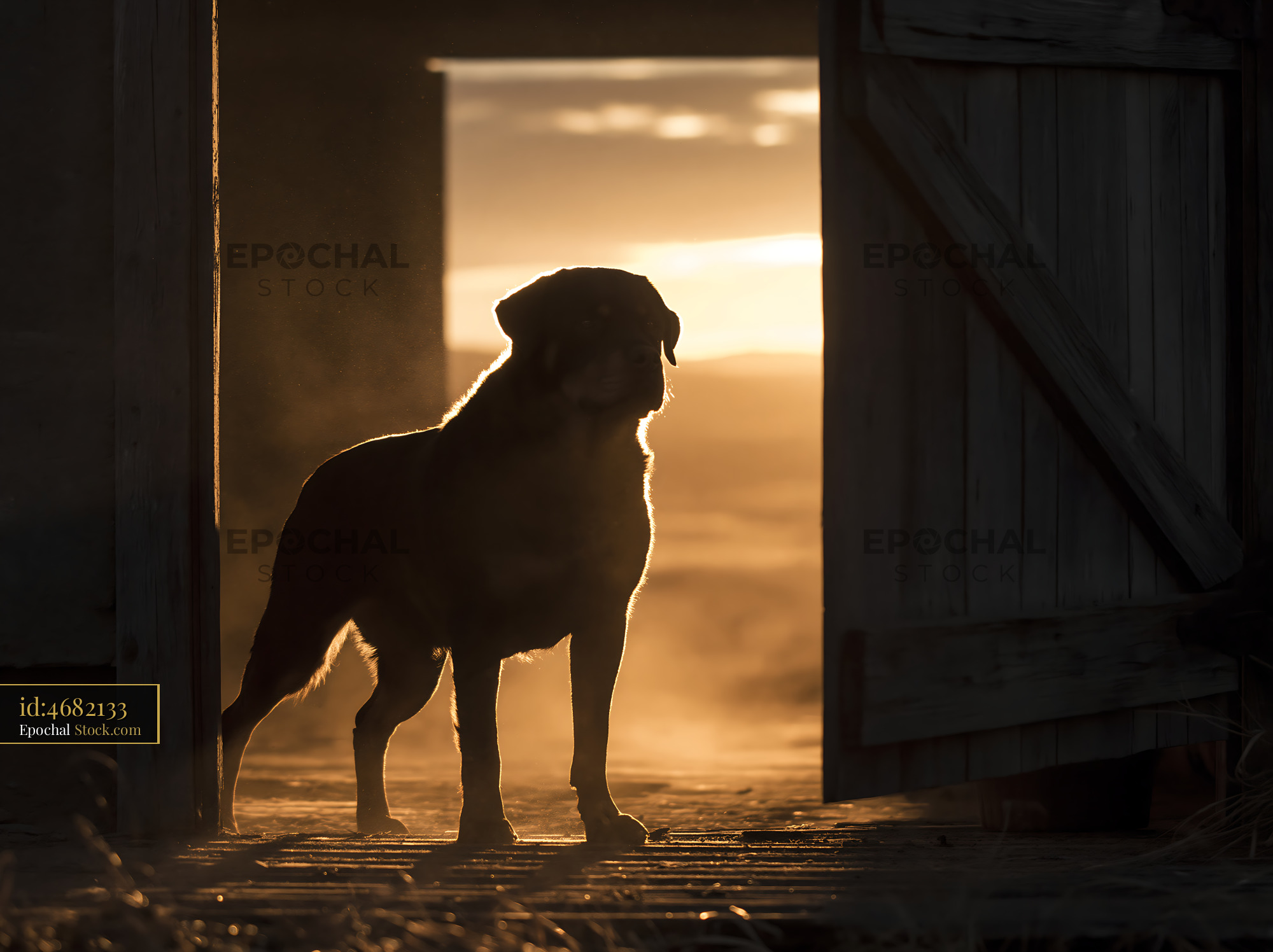 A loyal Rottweiler stands as a silhouette in an open barn door, framed by the warm glow of a setting sun, evoking feelings of protection, home, and quiet companionship.