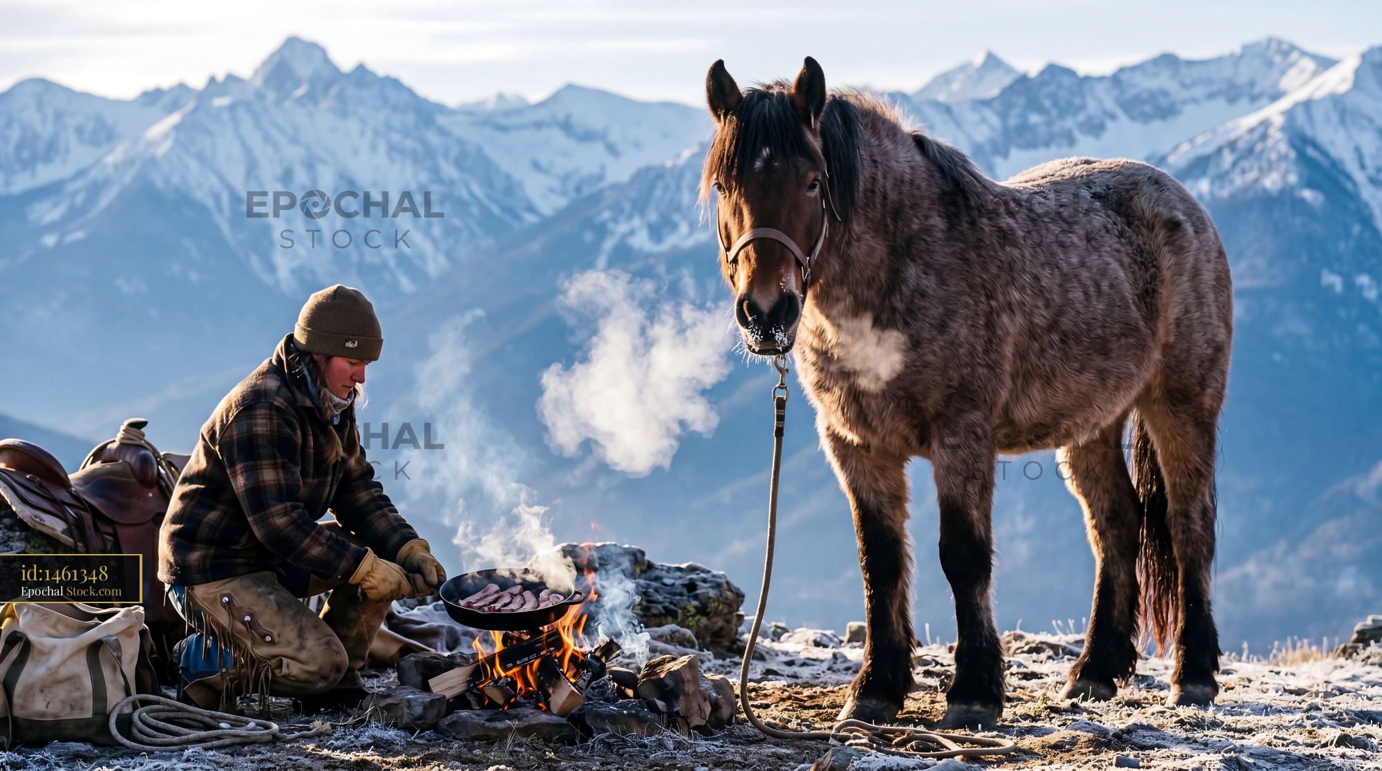 Rugged Mountain Cowgirl and Winter Roan Horse