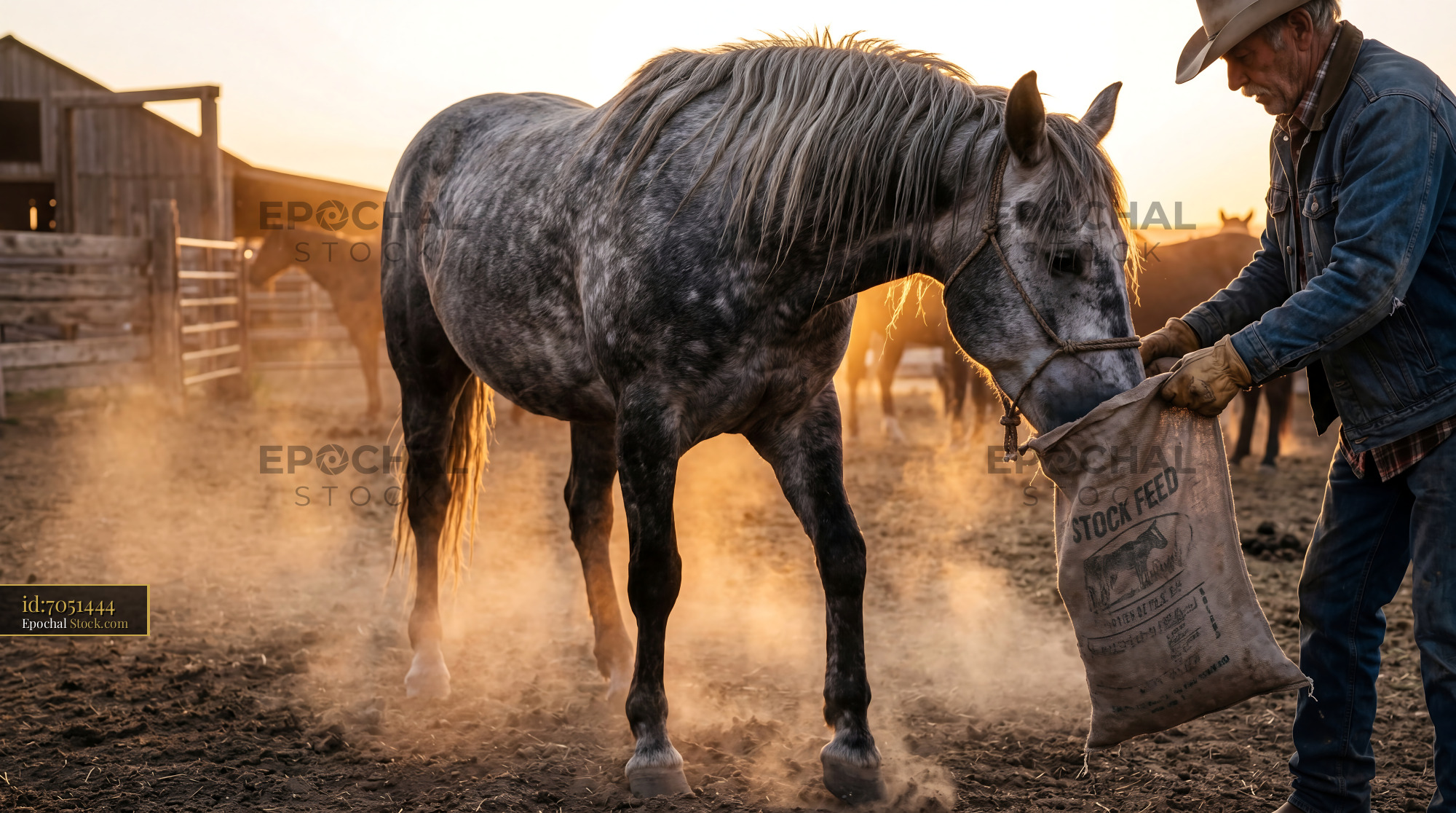 Rustic Cowboy Feeding Dapple Grey Mustang
