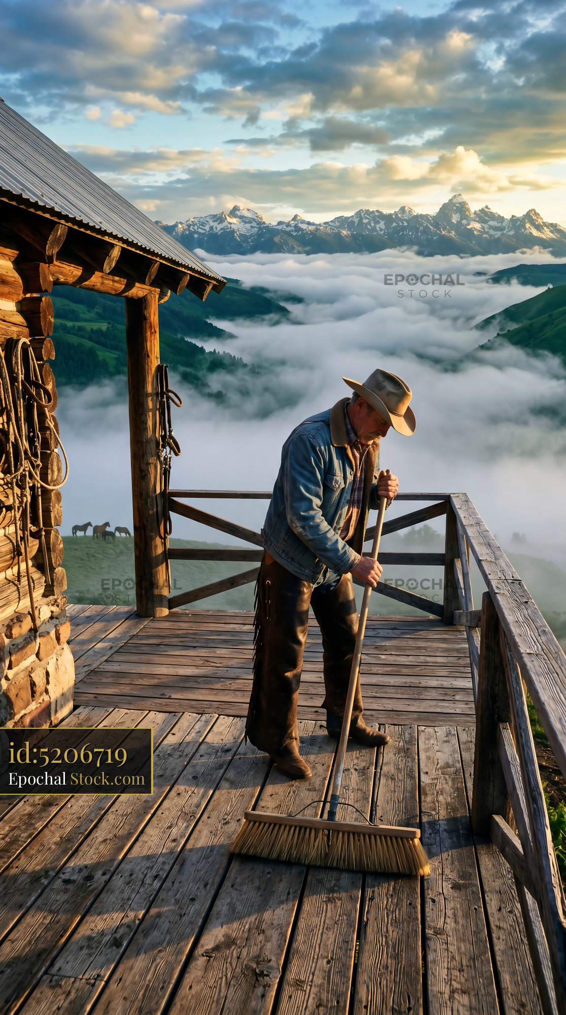 This scenic ranch pattern features a cowboy sweeping a porch overlooking a misty valley. Perfect for western-themed quilting, rustic wallpaper, or cabin home decor.