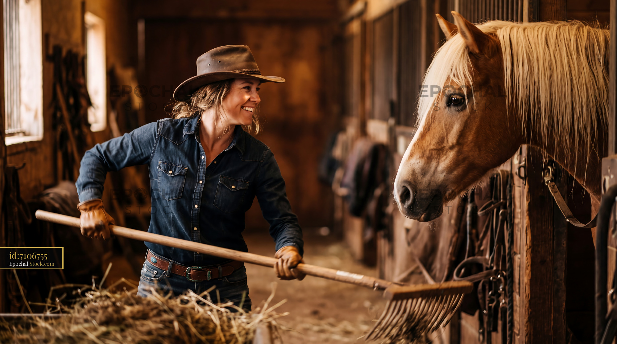 Rustic Cowgirl and Haflinger Horse Stable Scene