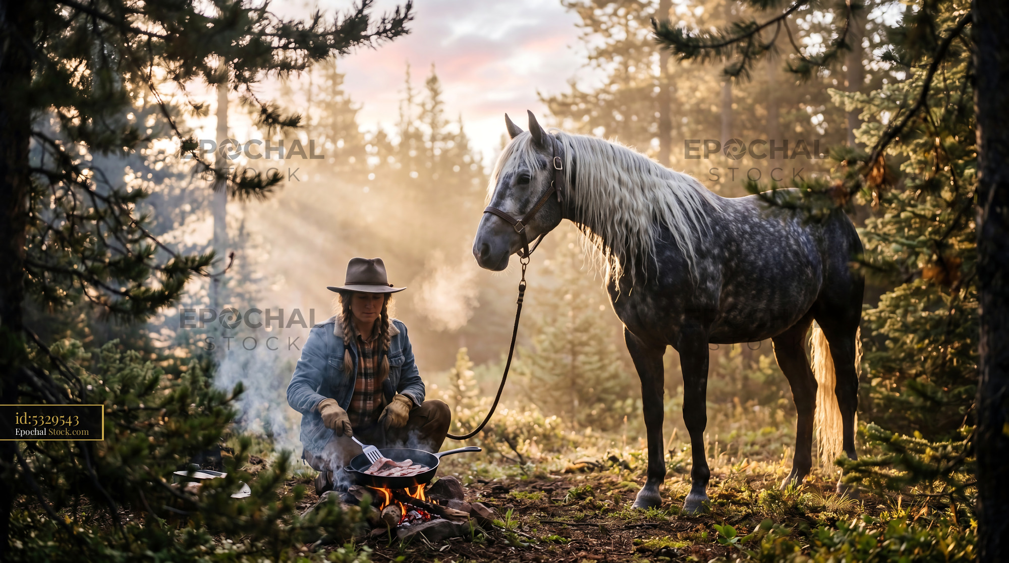 Atmospheric editorial photograph of a cowgirl cooking in the wild. Perfect for rustic home decor, lodge wallpaper, and western-themed quilting projects.