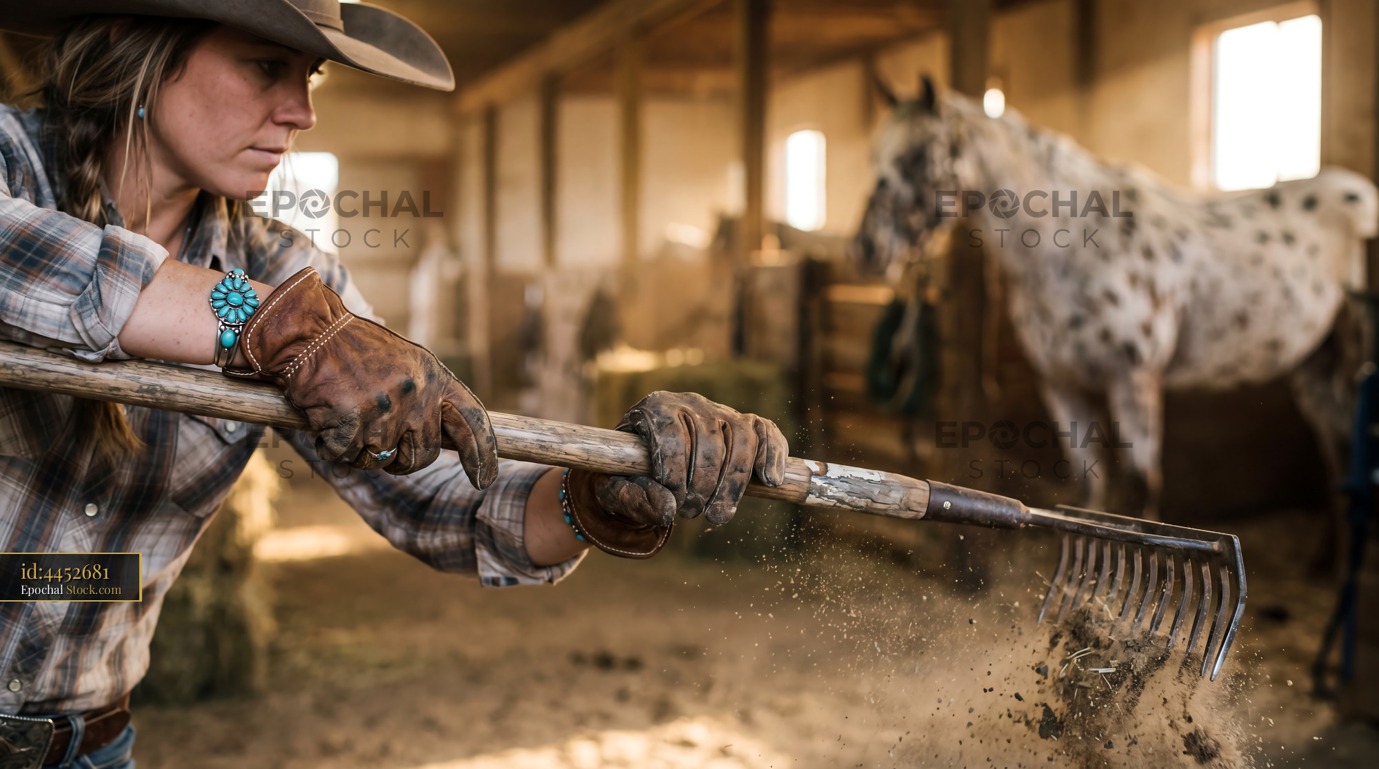 This realistic equine pattern features a cowgirl working in a stable. Perfect for western-themed quilting, rustic home decor, ranch wallpaper, or unique gift wrap for horse lovers.
