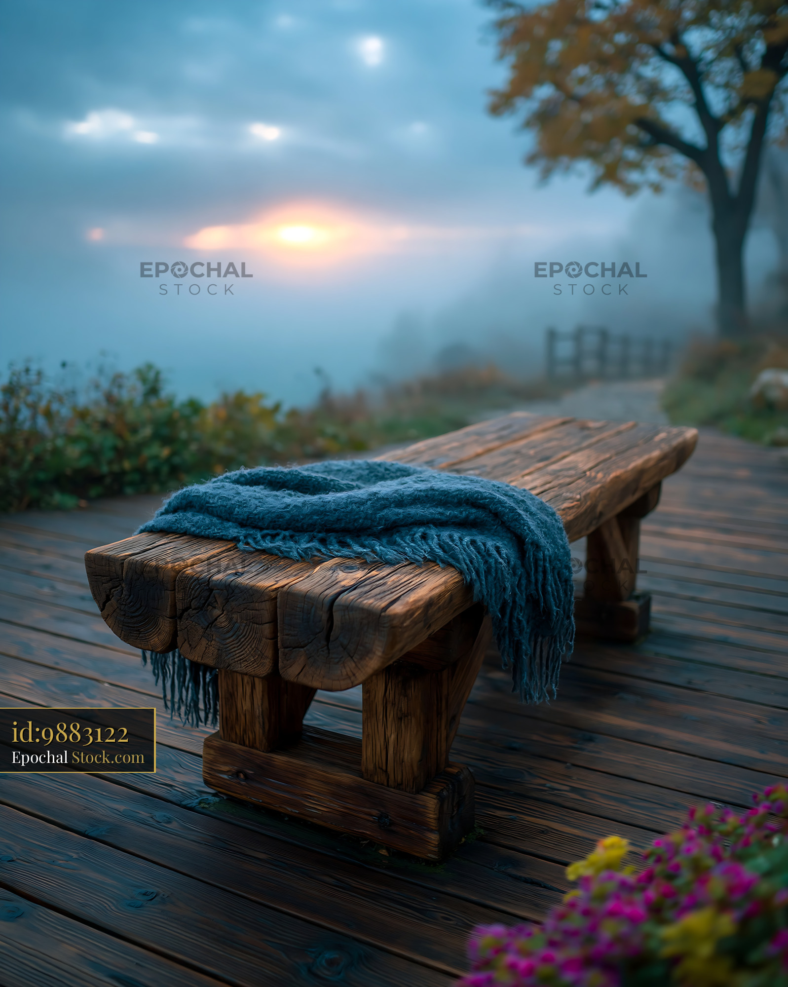 Rustic wooden bench with striped throw on bench at misty sunrise