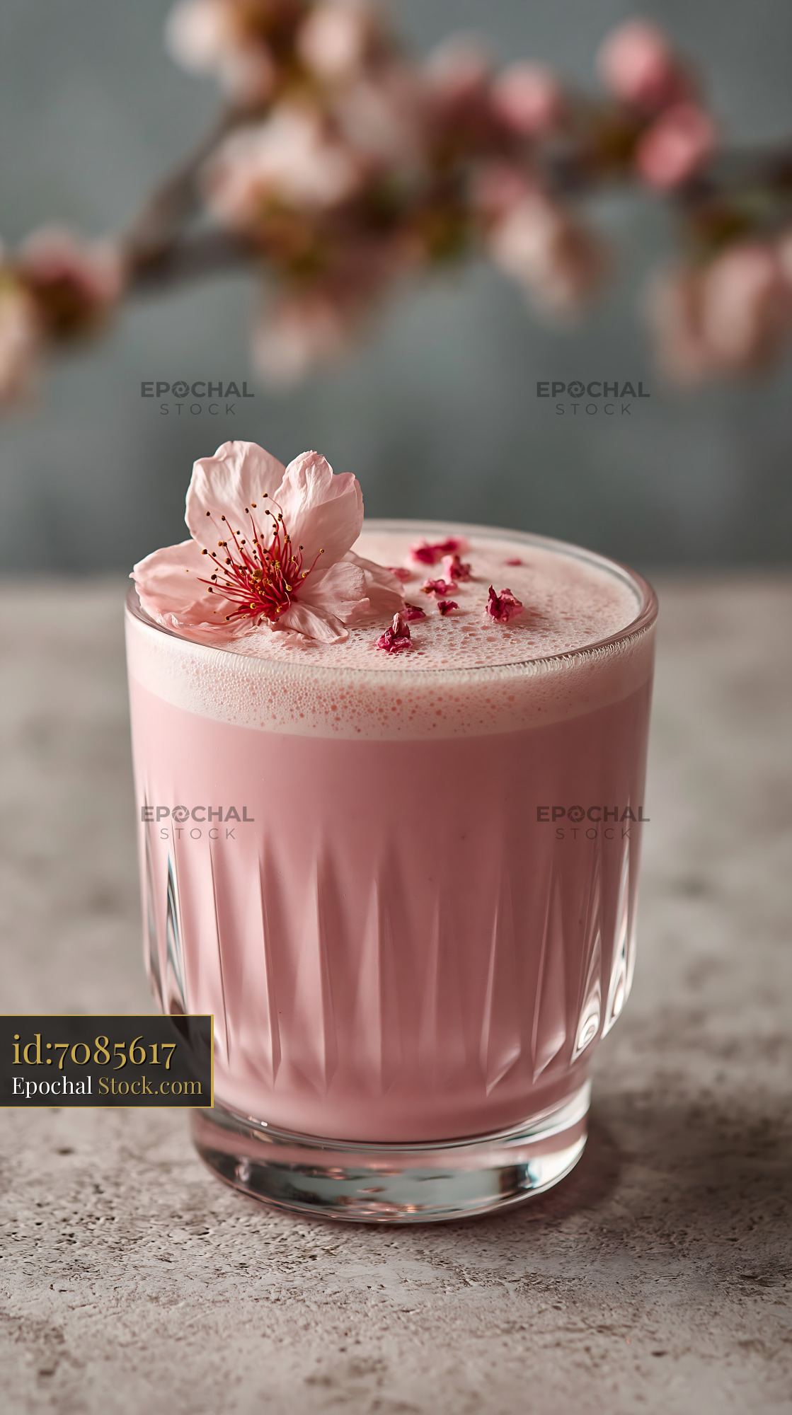 Creamy pink cherry blossom smoothie in a crystal glass garnished with a fresh sakura flower, capturing the serene and delicate essence of a Japanese spring morning.