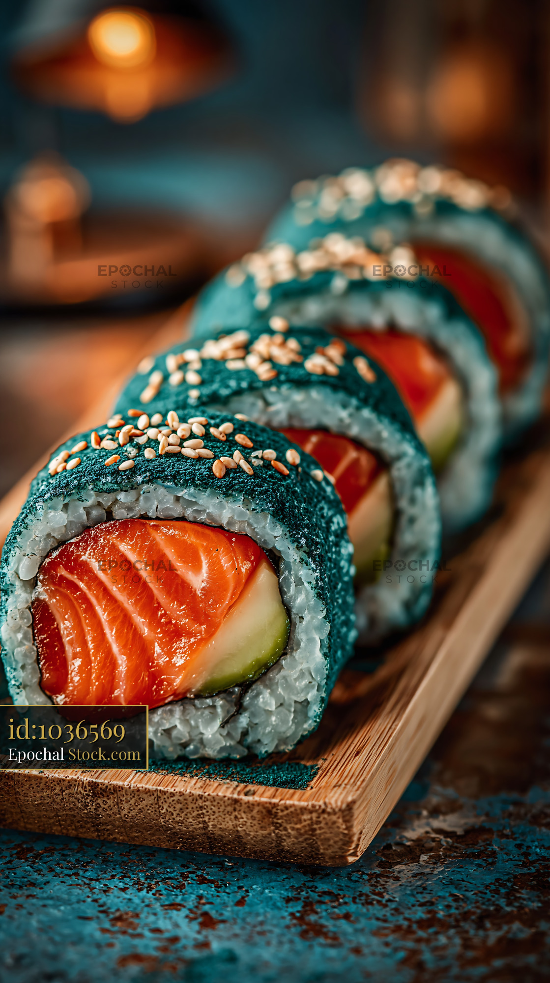 Fresh salmon and avocado sushi rolls featuring a unique chia seed crust and sesame seeds, presented in a warm, atmospheric restaurant setting with vibrant teal and orange color contrast.