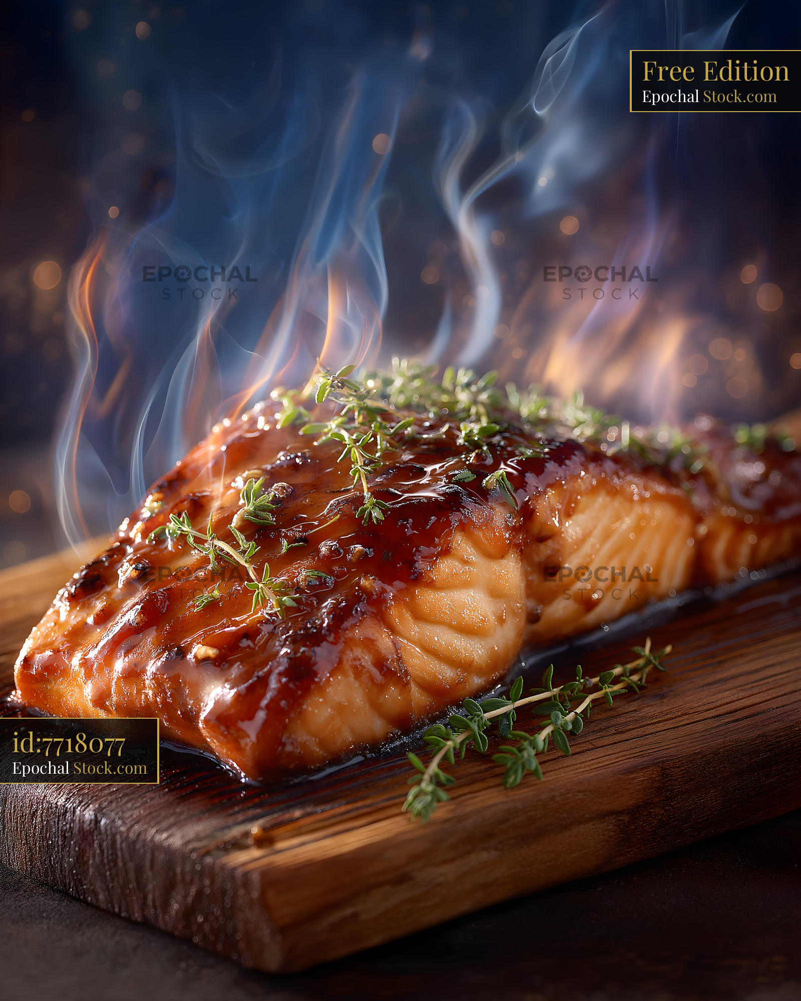 Salmon cooking on a wooden board with smoke and herbs Free Premium Stock Photo