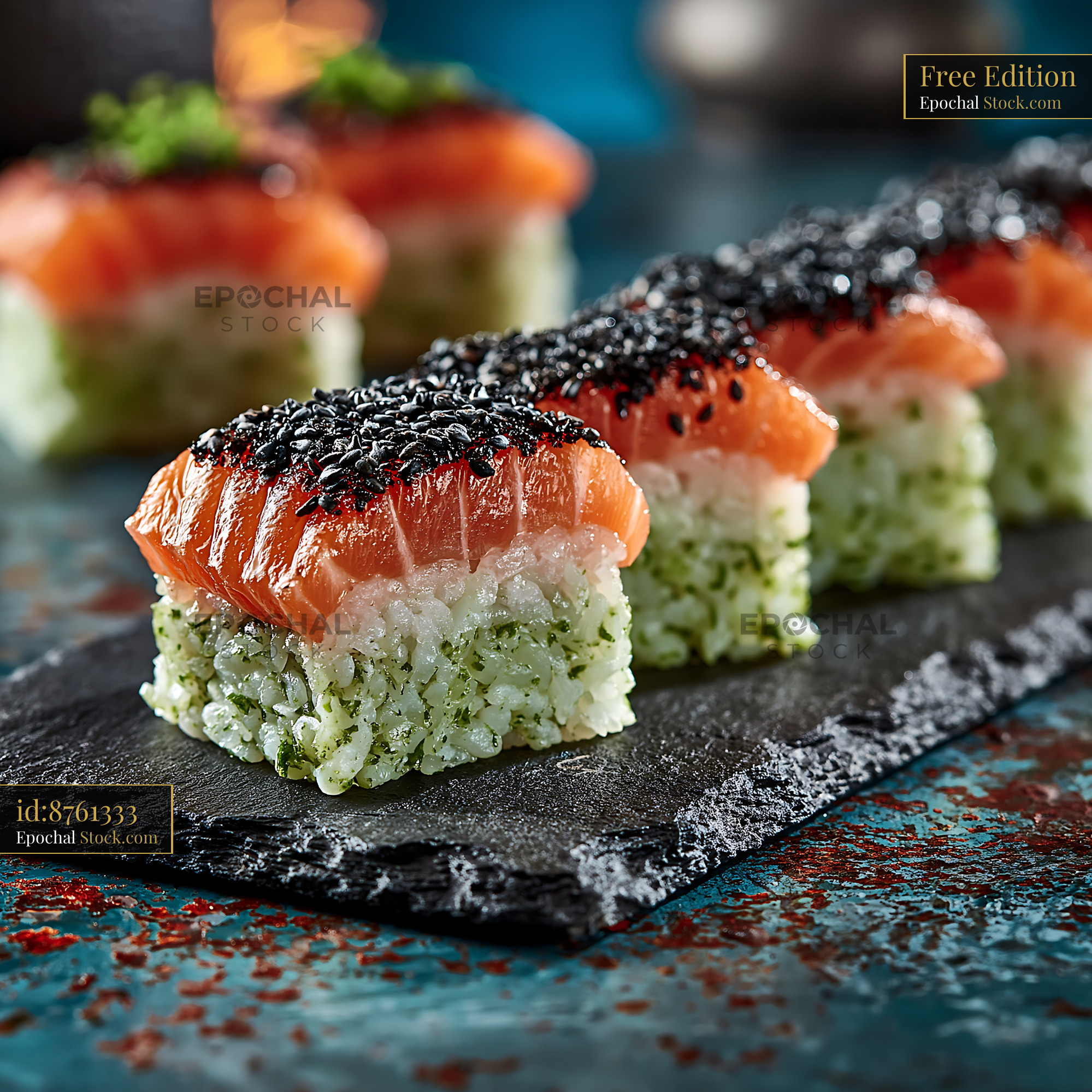 Modern fusion sushi featuring fresh salmon and spirulina-infused rice topped with black sesame, conveying a healthy and luxurious gourmet dining experience with vibrant colors.
