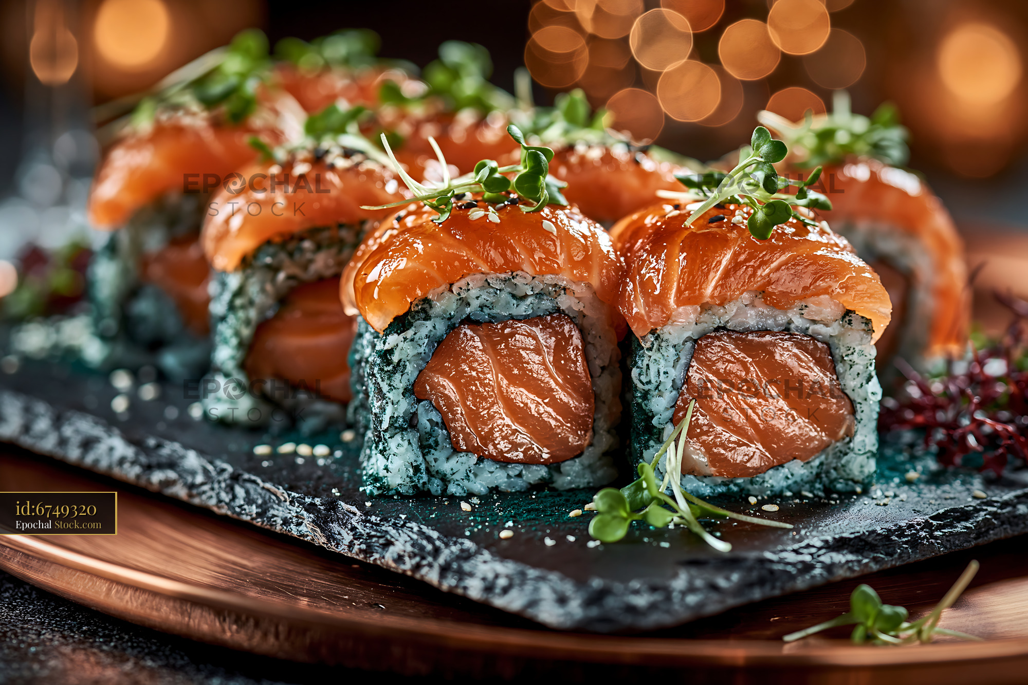 Gourmet salmon uramaki rolls featuring vibrant spirulina powder rice and fresh microgreens, evoking a modern healthy dining experience with elegant warm bokeh lighting.
