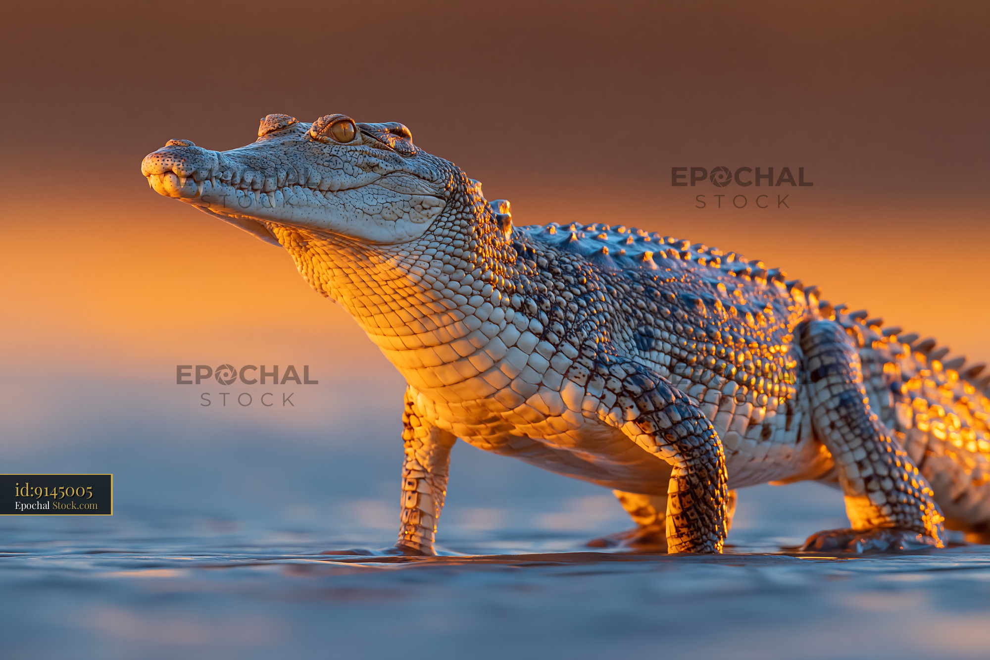 A powerful saltwater crocodile stands alert in shallow water during the golden hour, its scales glowing in the warm light, capturing the primal essence of wildlife survival and patience.
