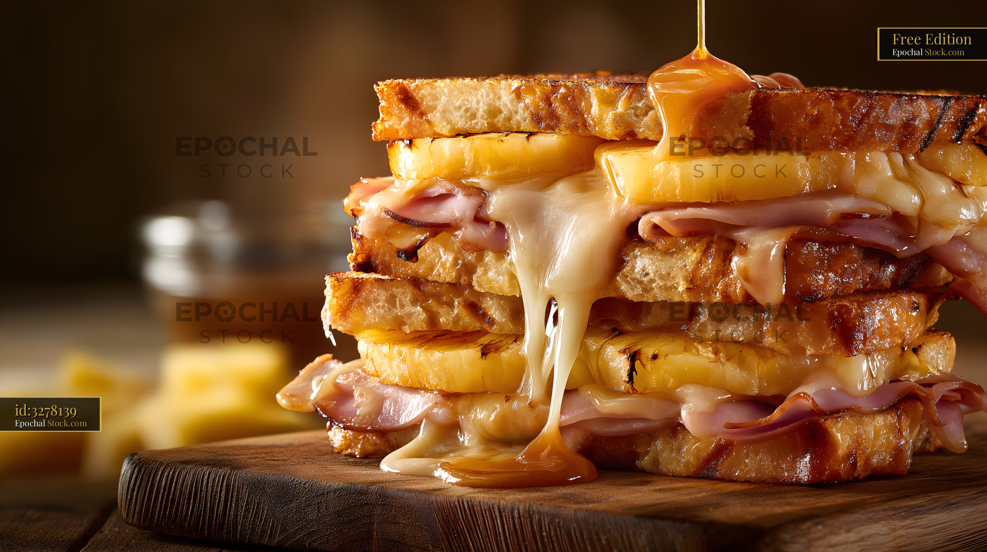 A sandwich is stacked with layers of cheese, ham, and pineapple. Honey is drizzling down the sides. The scene shows warm light and a wooden board with soft focus in the background.