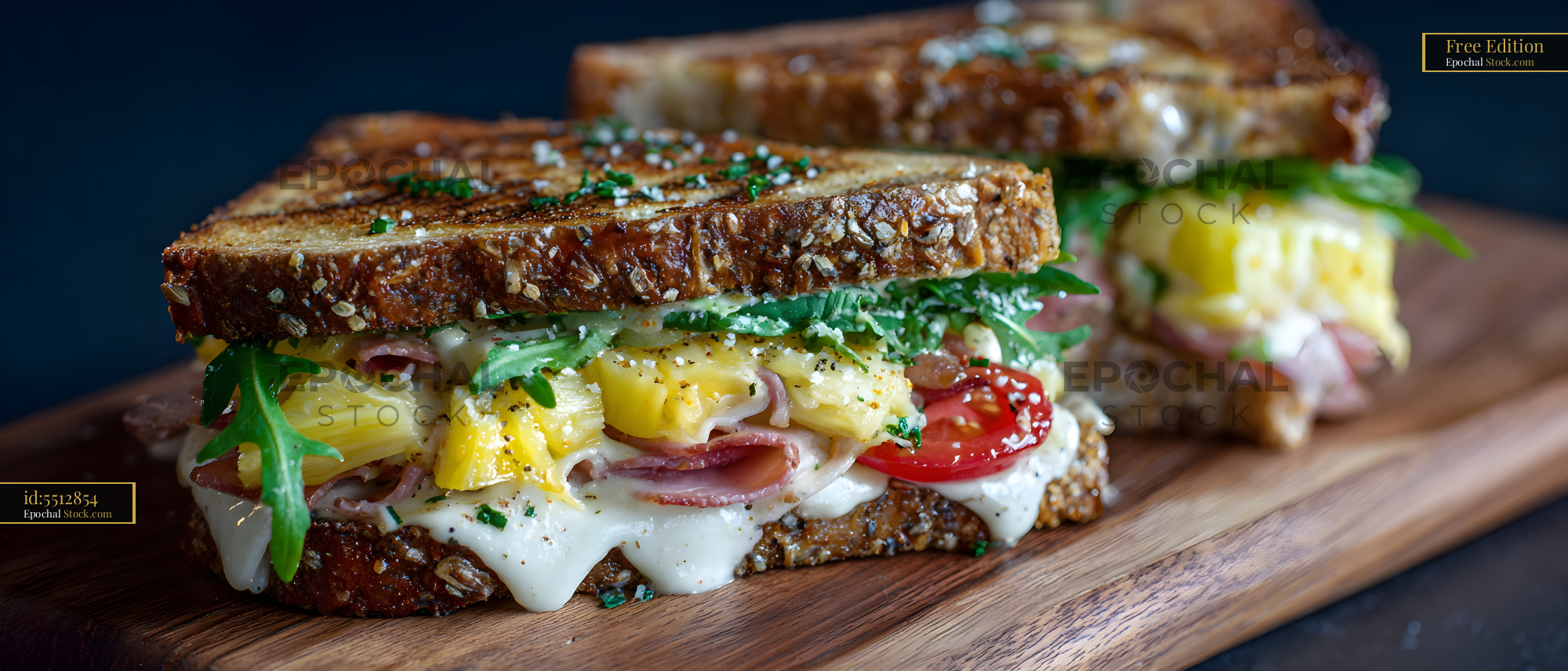 Two sandwiches sit on a wooden board. Each has layers of ham, cheese, pineapple, and greens. The bread is toasted and has seeds on top.