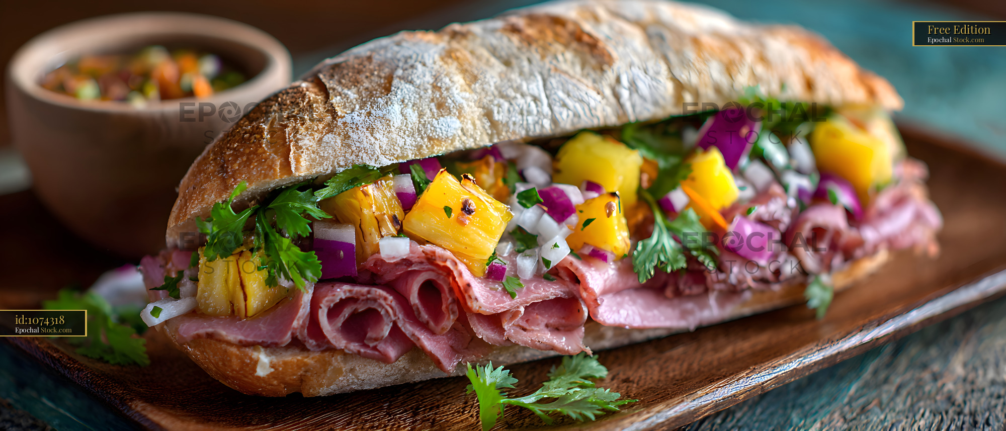 Sandwich with ham, pineapple, and vegetables on wooden plate Free Premium Stock Image