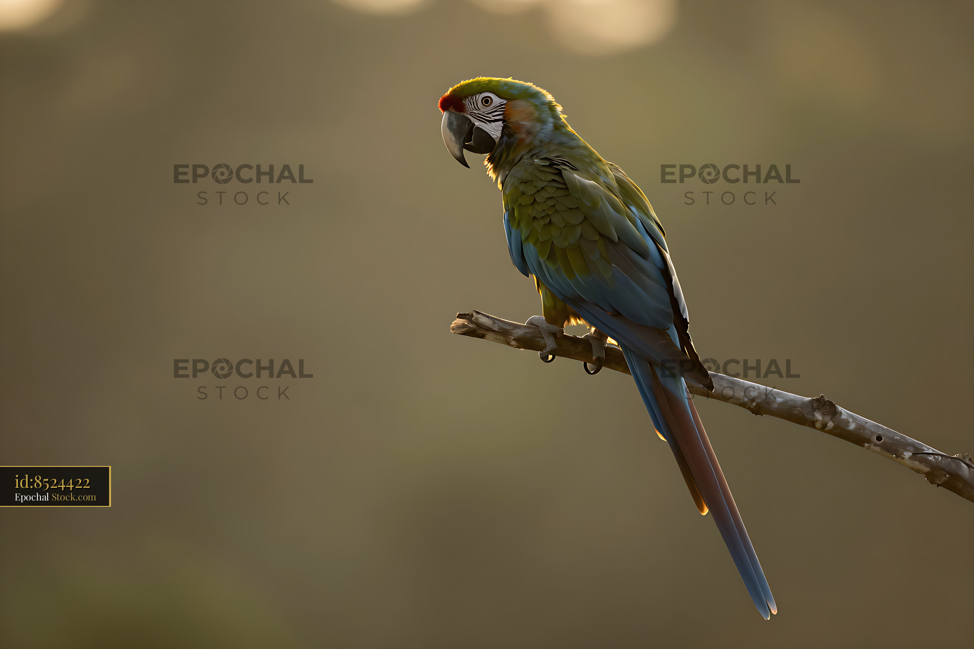 A vibrant Scarlet Macaw sits peacefully on a slender branch, illuminated by the warm glow of the setting sun, capturing the essence of tropical wildlife and natural serenity.