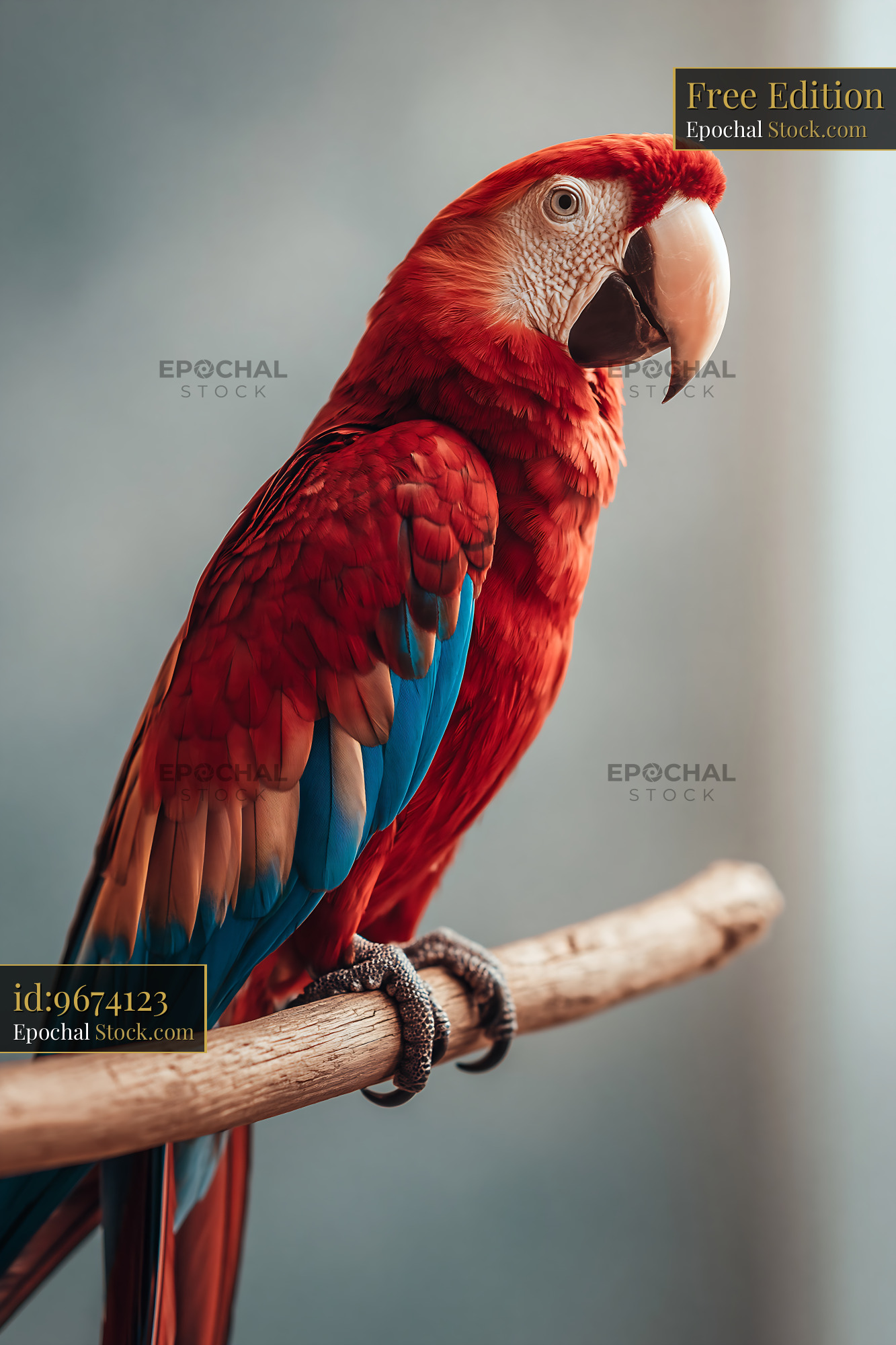 Scarlet macaw perched on a wooden branch against a soft background