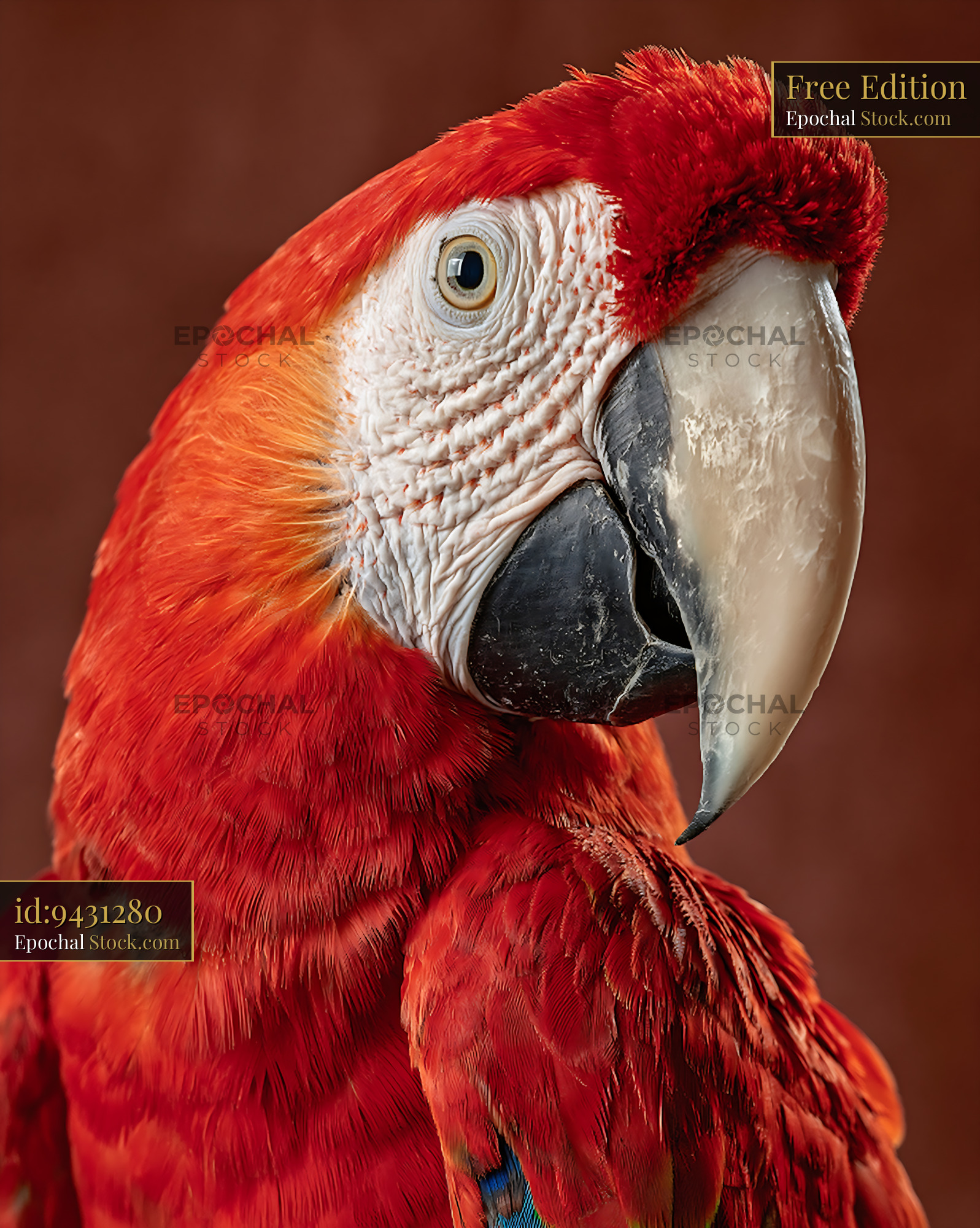 Scarlet macaw portrait with vibrant red plumage on brown background