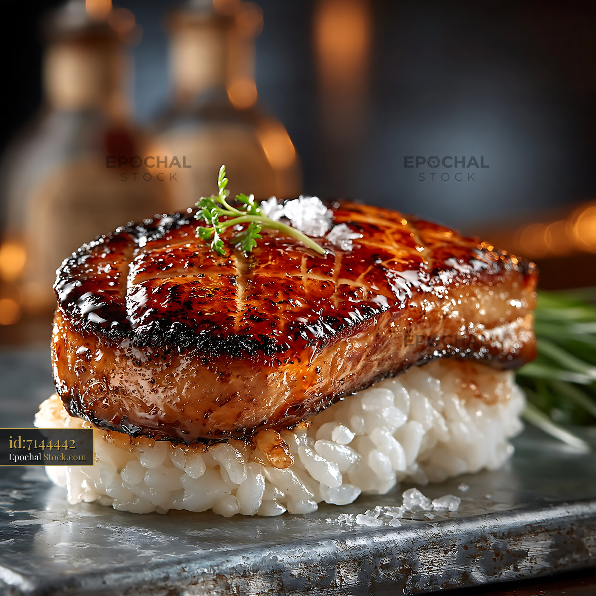A gourmet fusion of French and Japanese cuisine featuring pan-seared foie gras on seasoned sushi rice, garnished with sea salt flakes and fresh herbs in an elegant restaurant atmosphere.