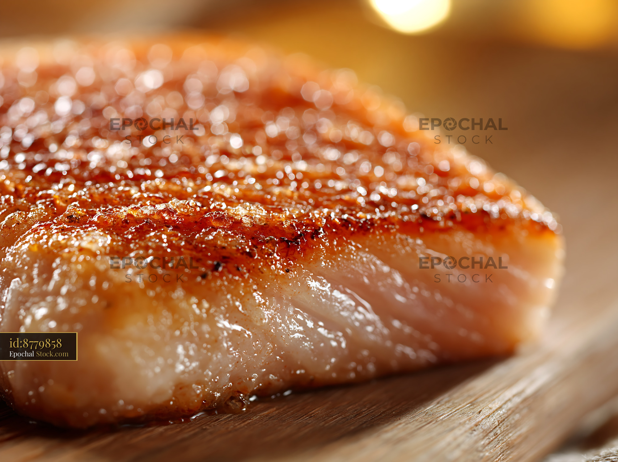 Seared salmon fillet with crispy golden skin on a wooden surface