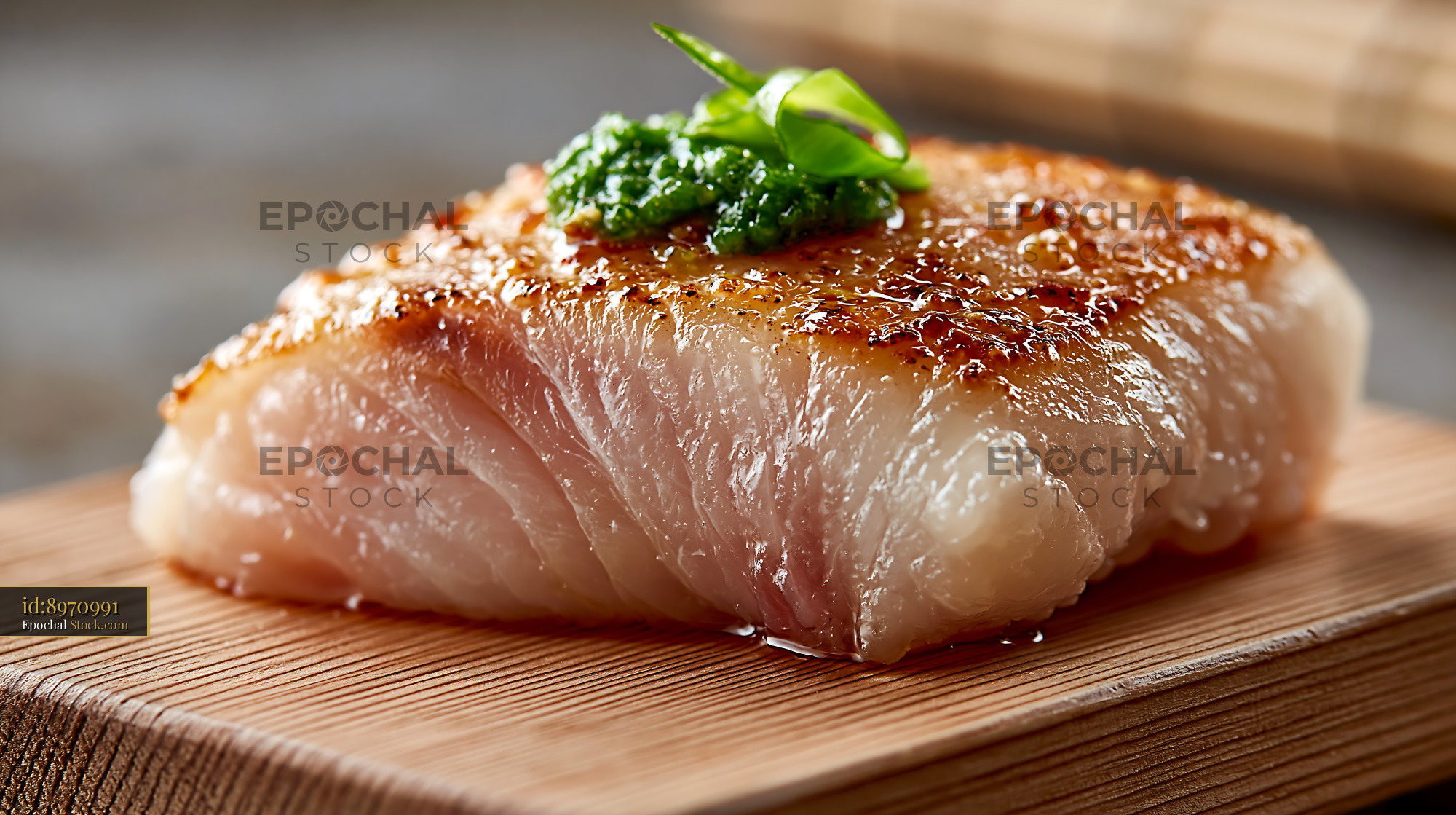 Premium hamachi yellowtail perfectly seared and topped with spicy yuzu kosho, capturing the essence of modern Japanese fusion and gourmet culinary art.