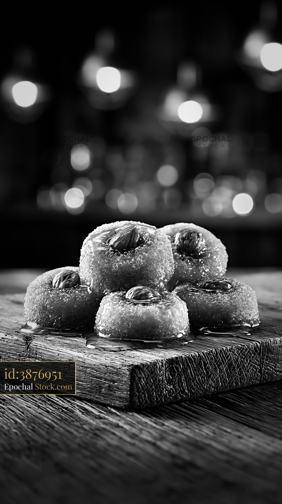 Traditional Turkish sekerpare hazelnut biscuits soaked in syrup, presented in a dramatic black and white setting with soft bokeh lights, evoking a sense of heritage and sweet indulgence.