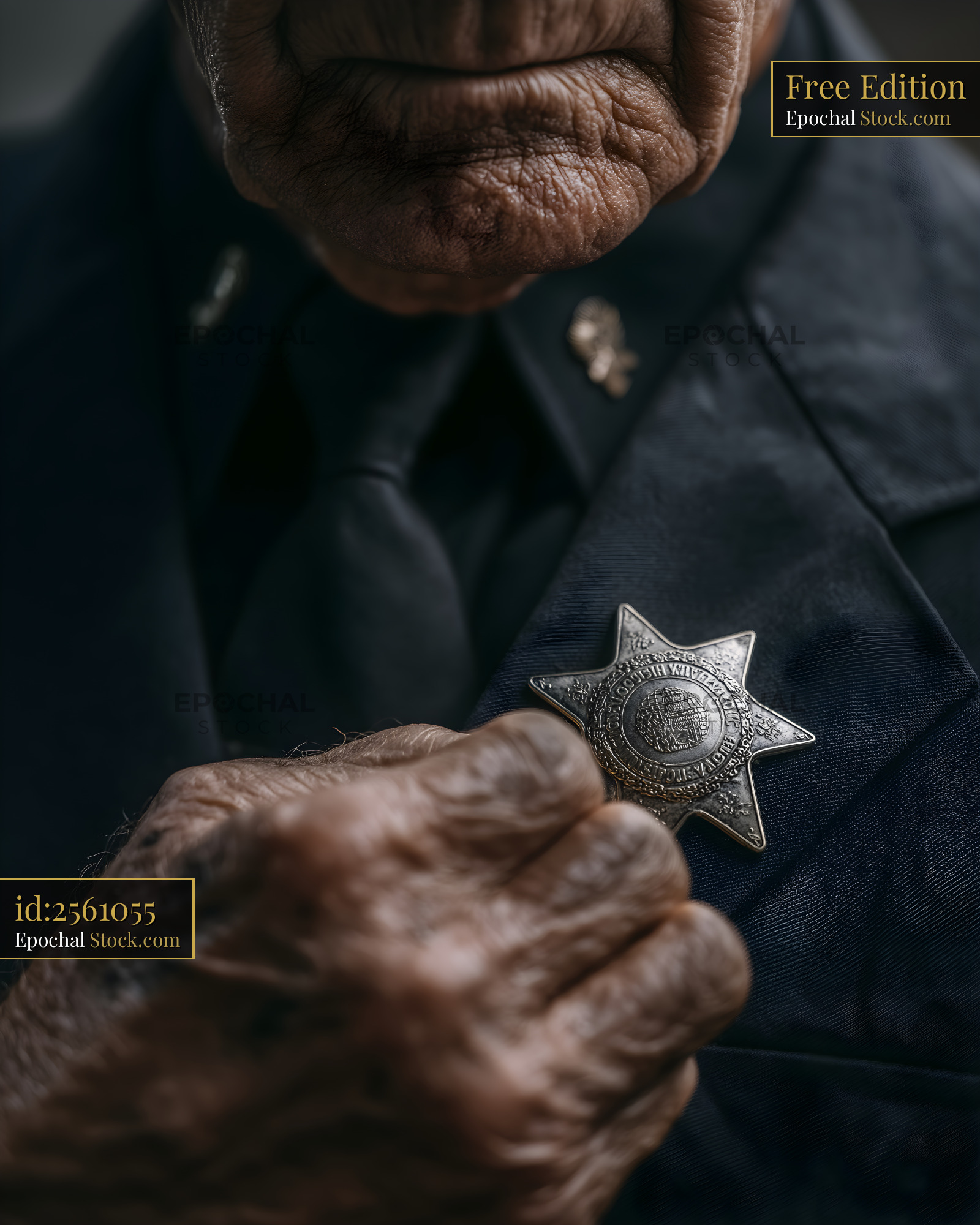 A senior officer stands proudly in uniform, holding his badge. The focus is on the details of the badge and the officer's weathered hands. This moment captures dedication and service.