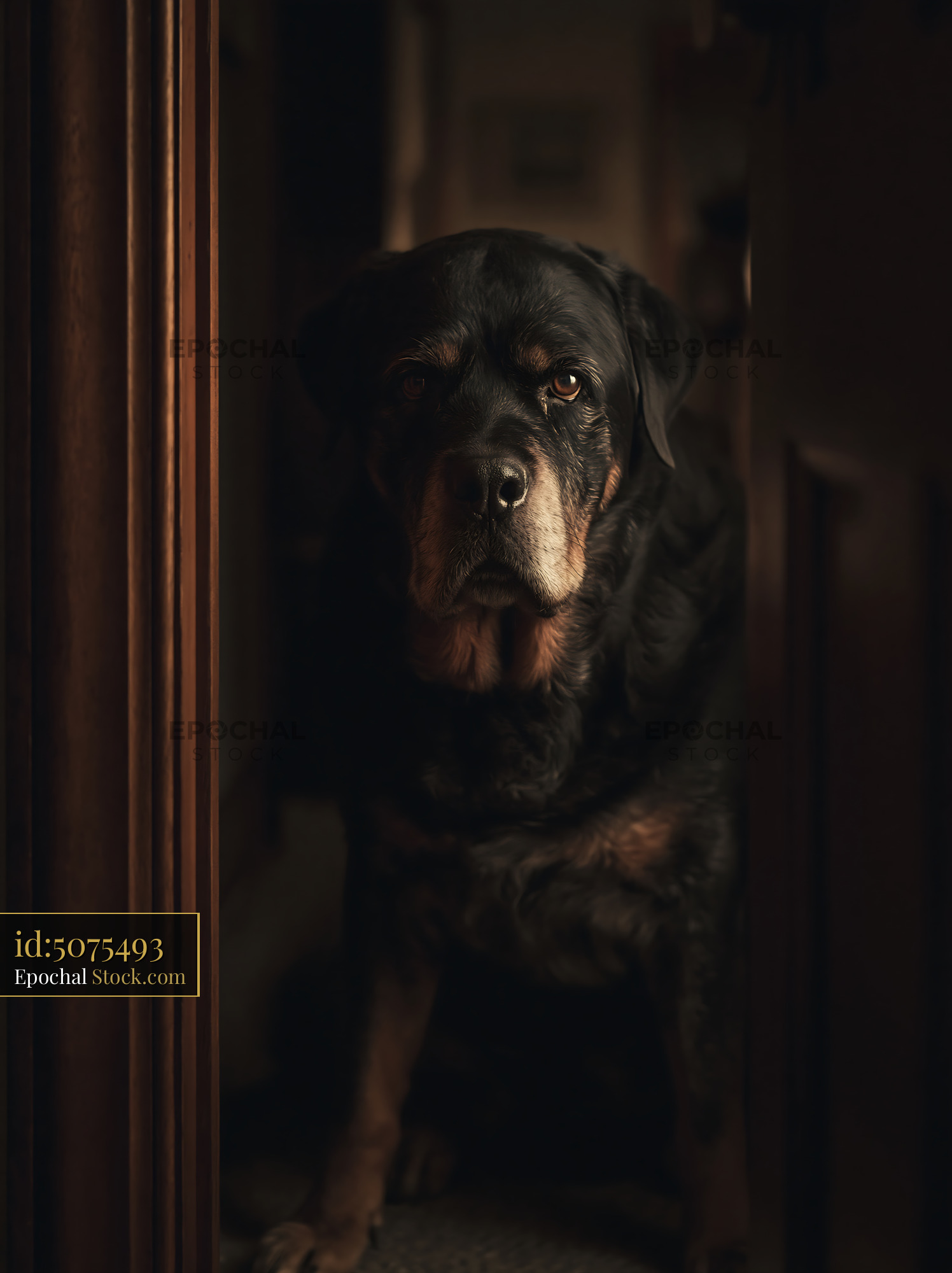 A loyal senior Rottweiler stands in a dimly lit doorway, his wise eyes reflecting devotion and protection in a moody, cinematic home setting.