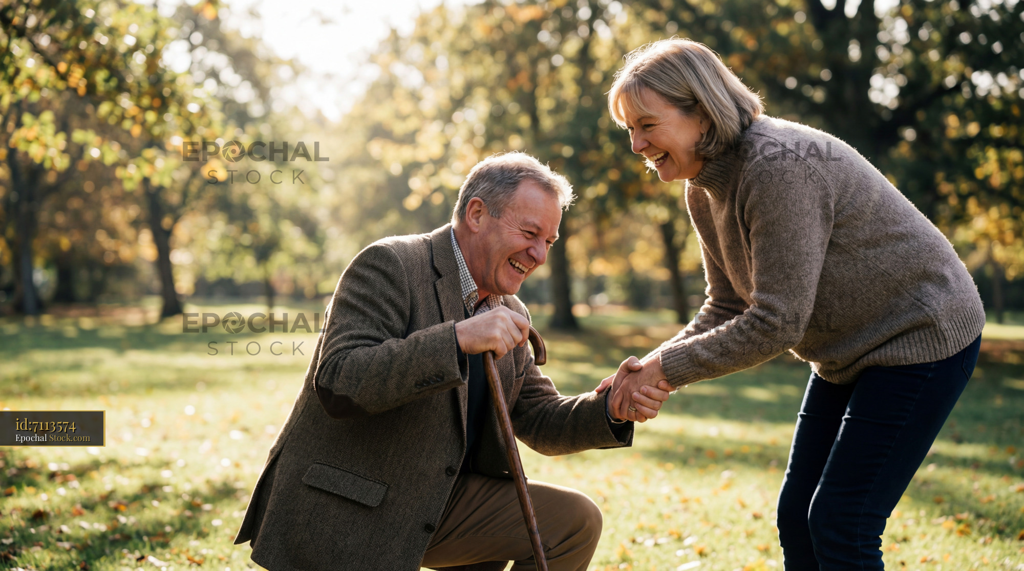 Two seniors smile and laugh while holding hands in a park. The man uses a cane and bends down, while the woman supports him. The setting shows trees with autumn leaves.
