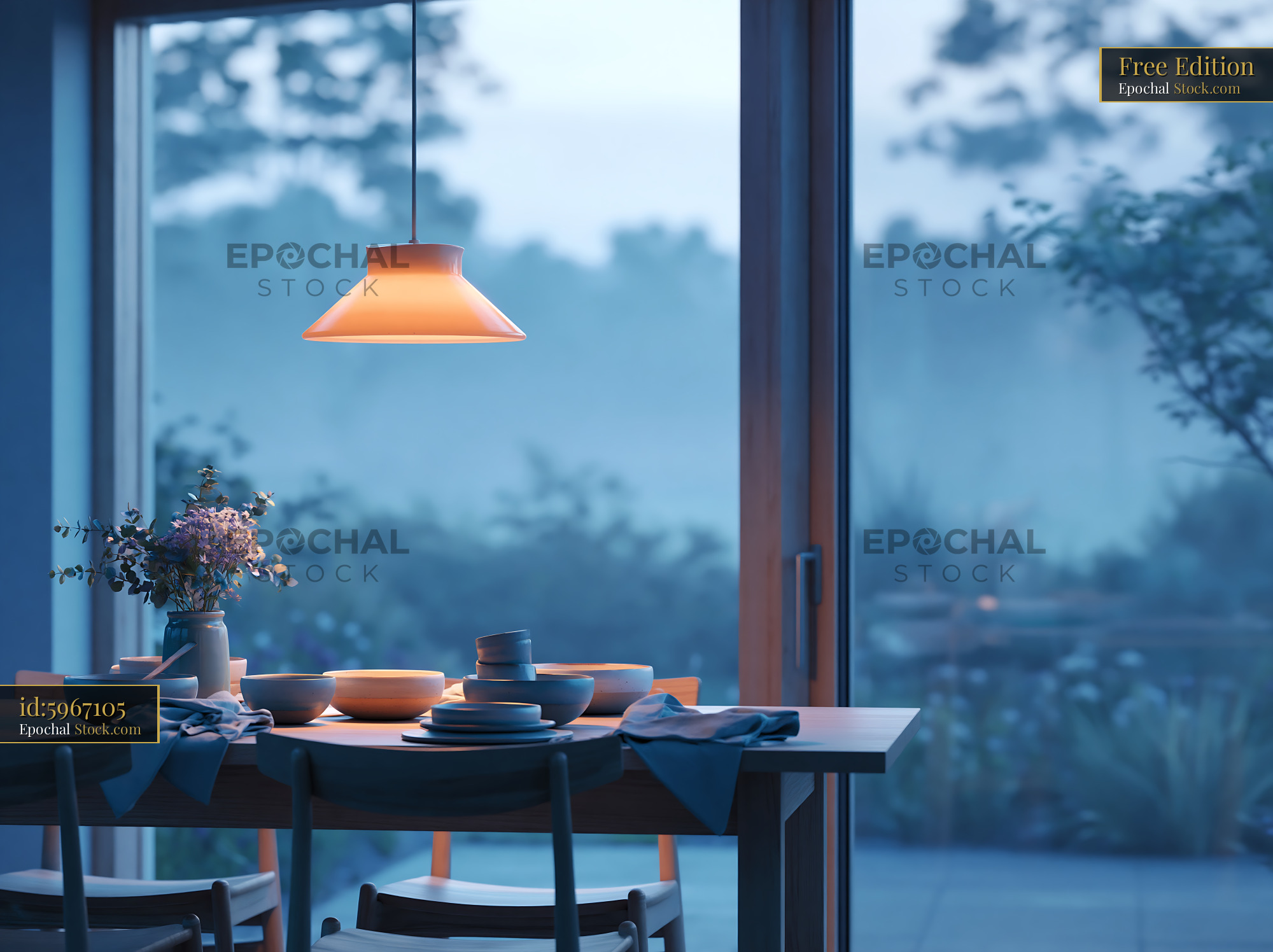 A minimalist dining table set with ceramic bowls sits under a warm lamp, overlooking a foggy garden at twilight, creating a peaceful and cozy atmosphere.