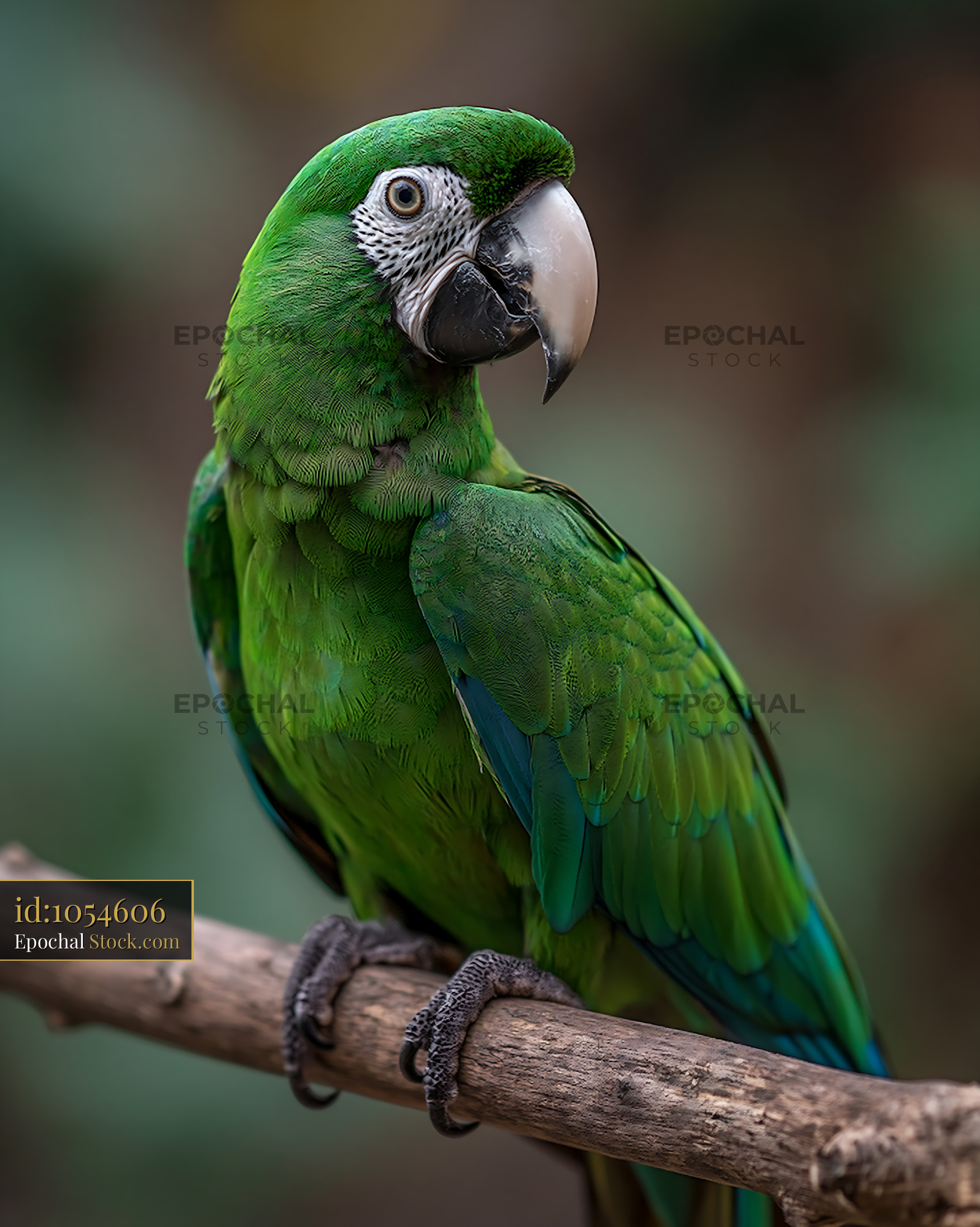 A detailed portrait of a severe macaw sitting on a wooden branch, capturing its vibrant green plumage and curious expression in a natural, serene environment.