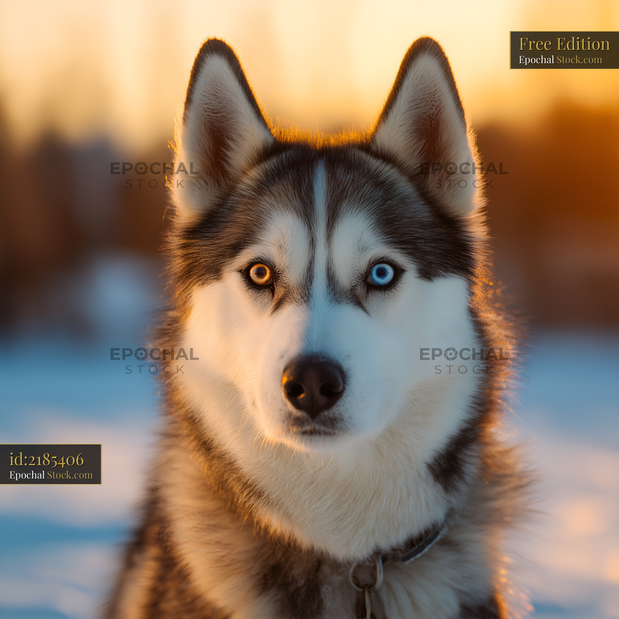 A Siberian husky sits in the snow as the sun sets behind. The dog's fur glows in the warm light, revealing its unique eye colors. Snow covers the ground and trees in the background.